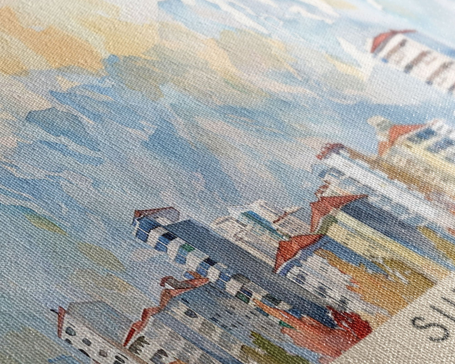Most of our canvases are made in the USA, with the exception of canvases ordered with the light oak unstained frames, and any large canvases (24x48, 30x60, 16x48 and 20x60) ordered WITH a frame. These are temporarily made in and shipped from Europe, while we try to find a more consistent supplier in the USA.