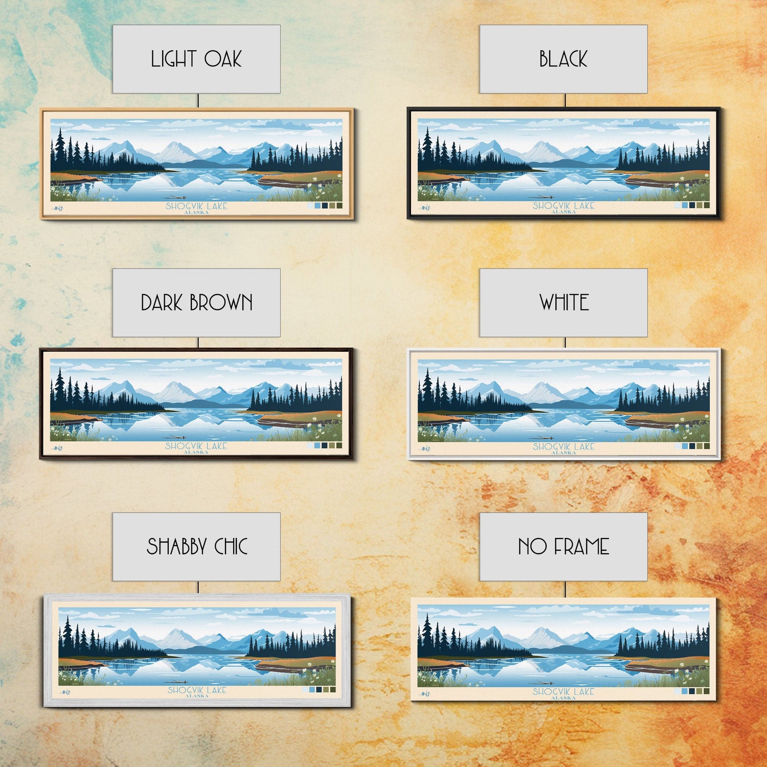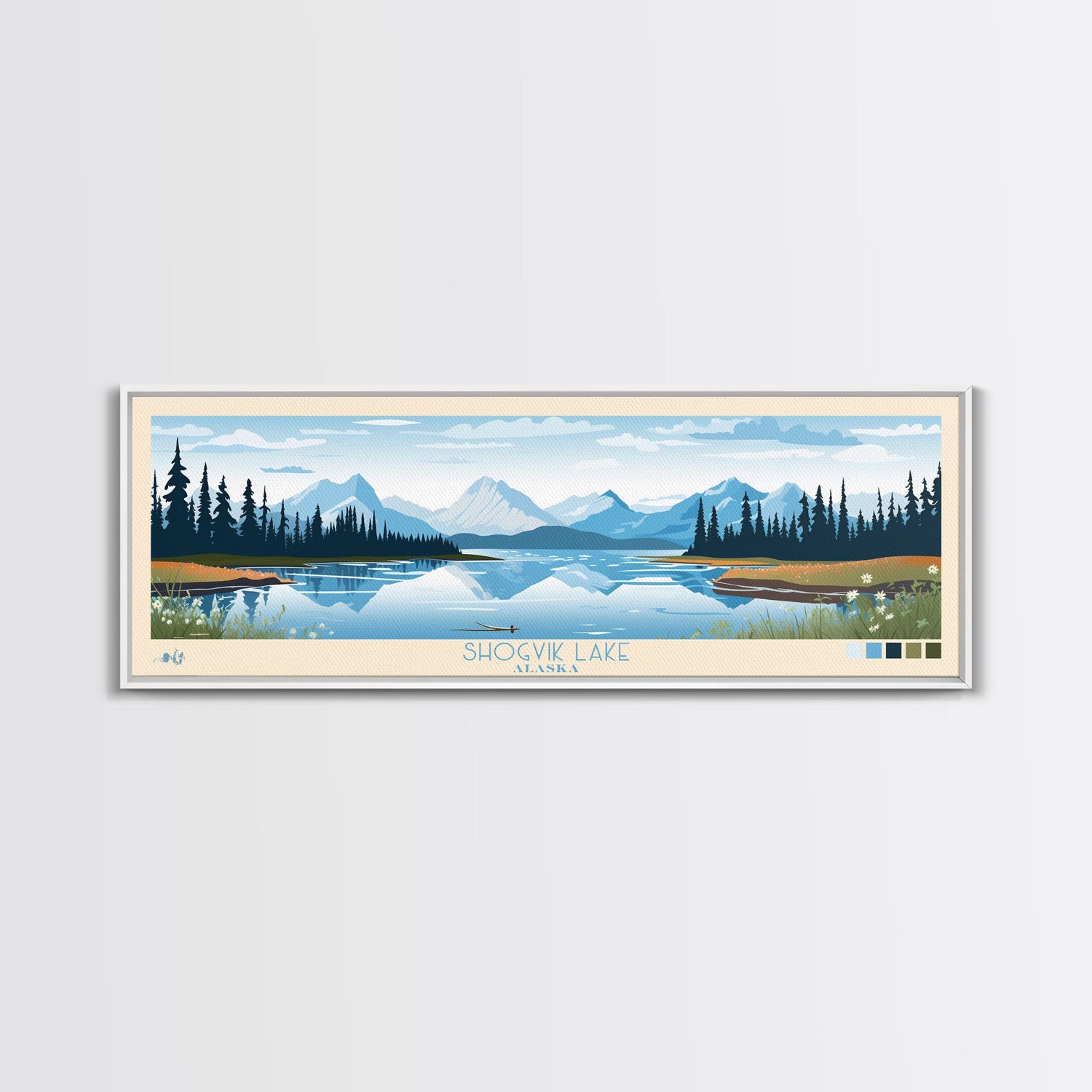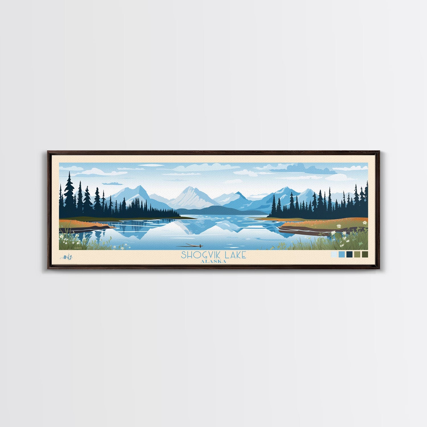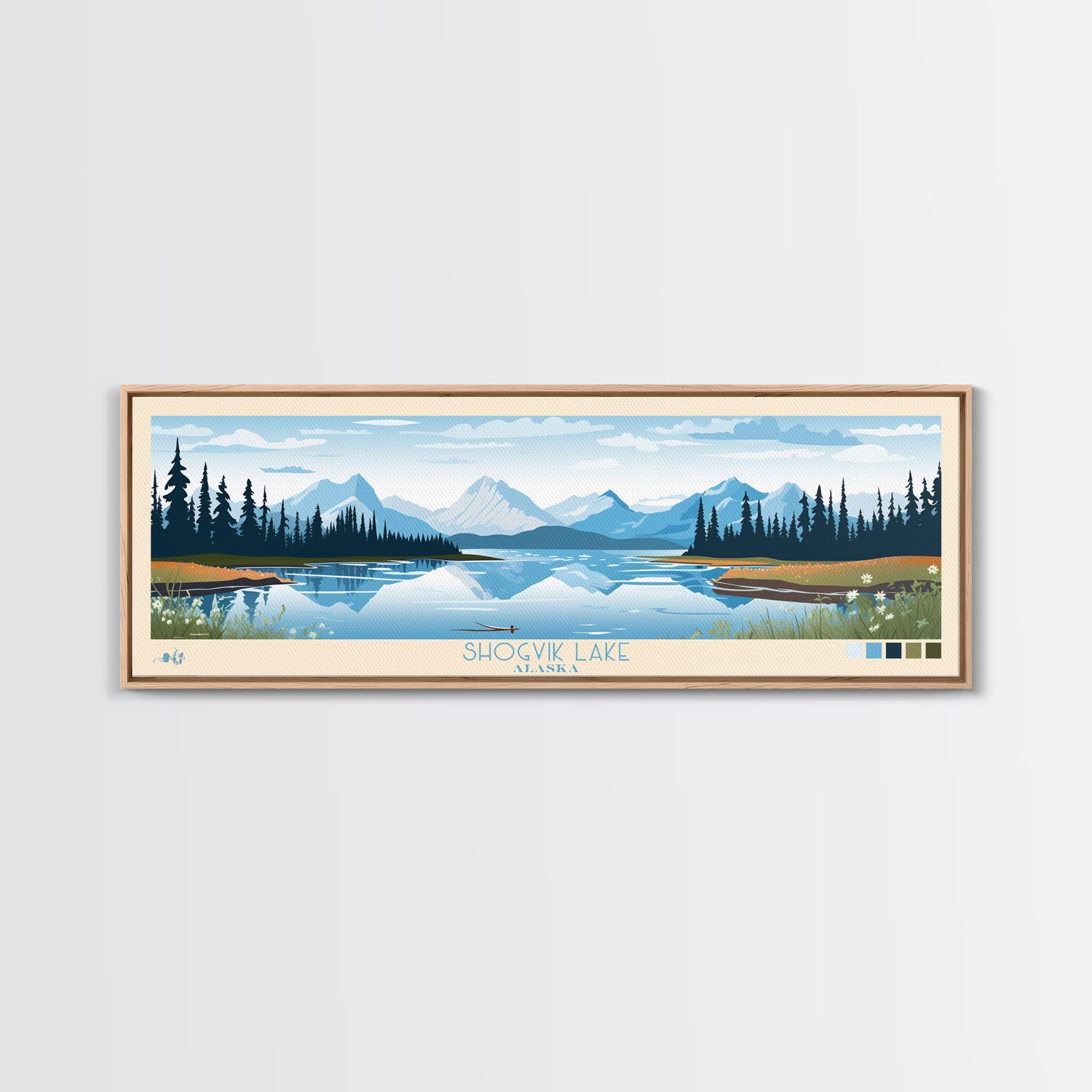 Shogvik Lake, Alaska Framed Canvas Print, Panoramic Travel Poster, Midcentury Modern Art, Home Decor, Pop Art, Wall Art - 10x30 Inches / No Frame - Stretched Canvas Only is backordered and will ship as soon as it is back in stock.