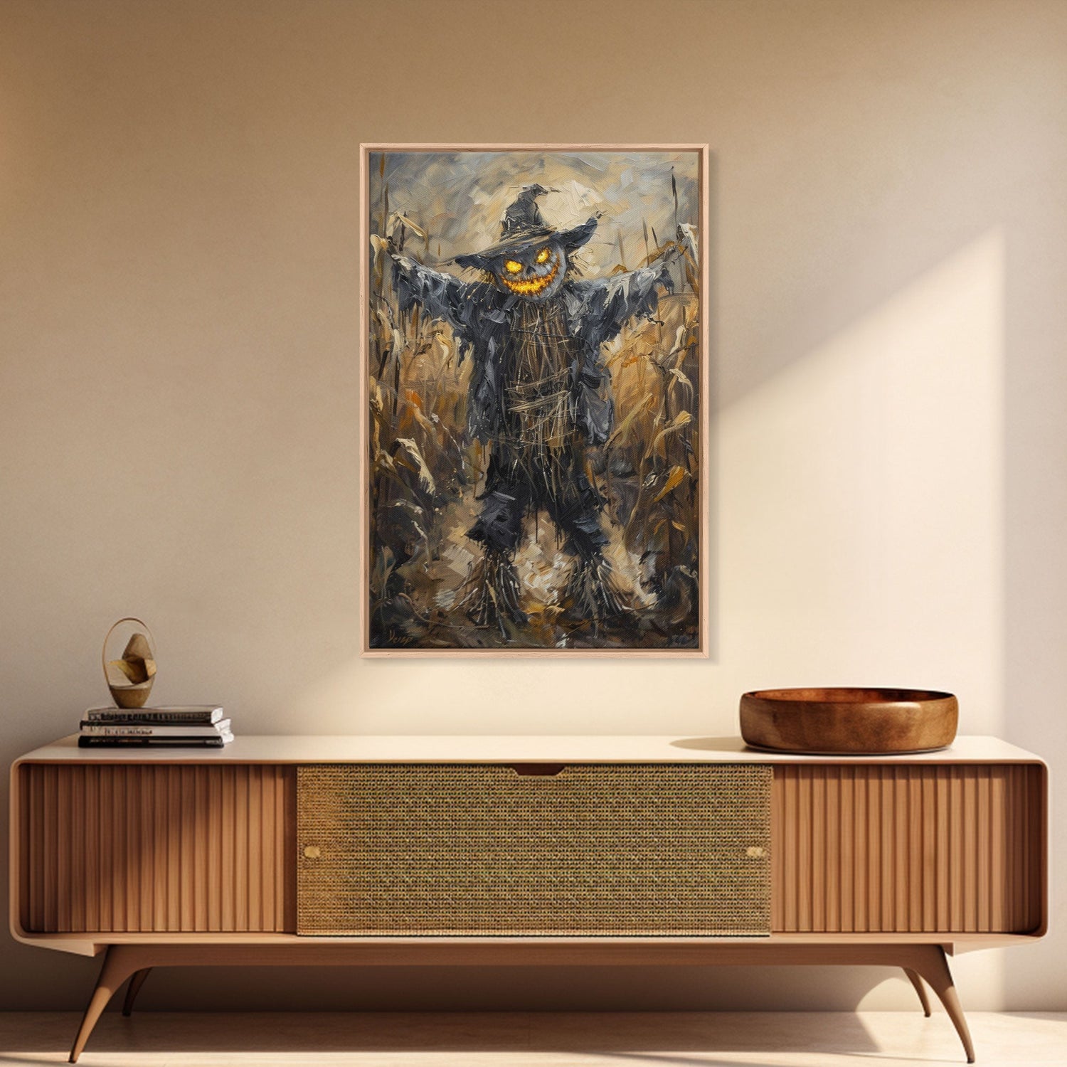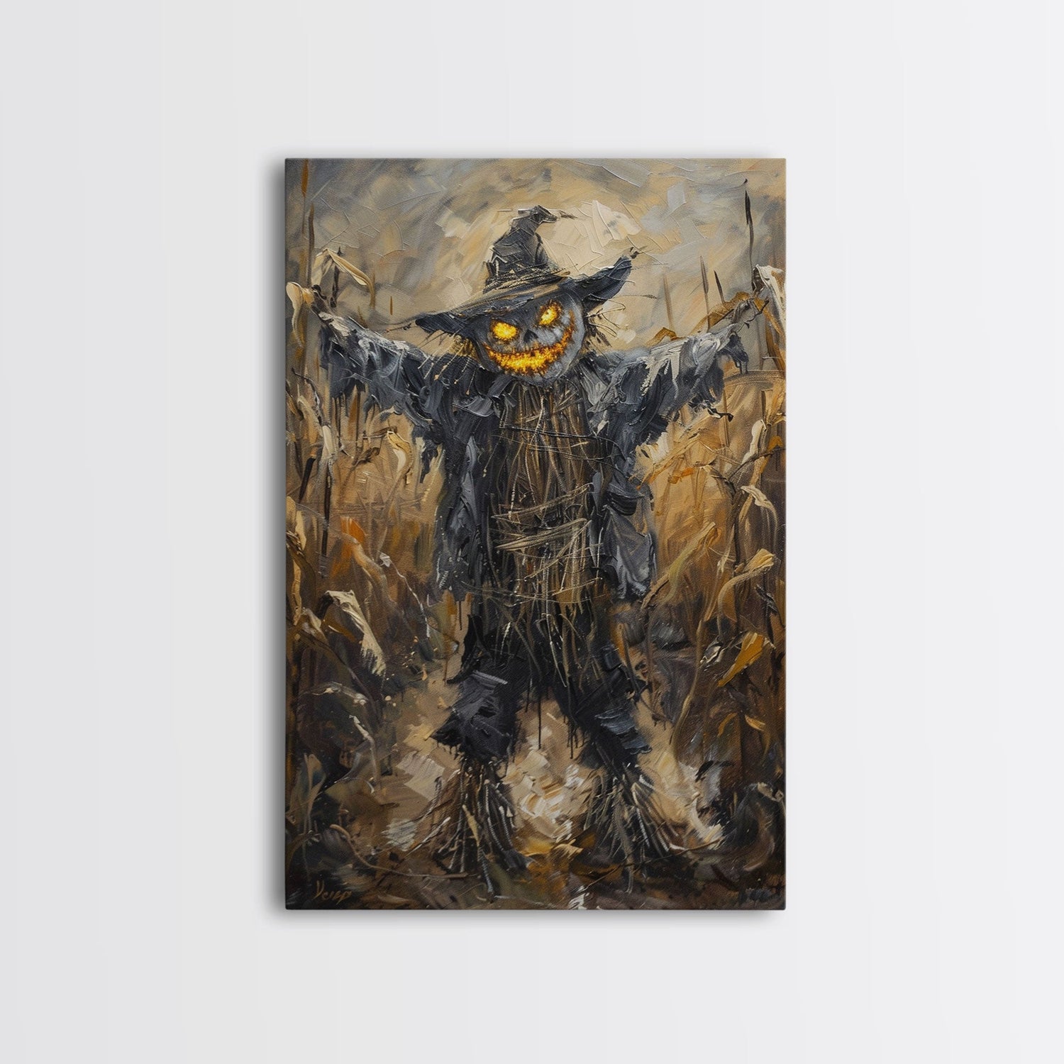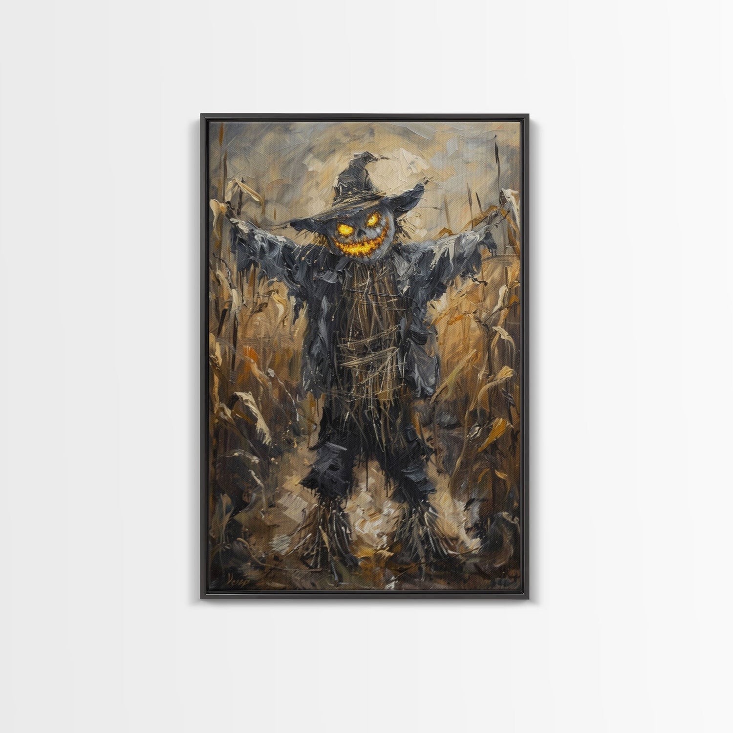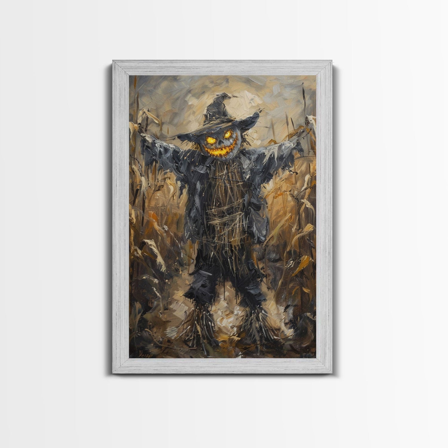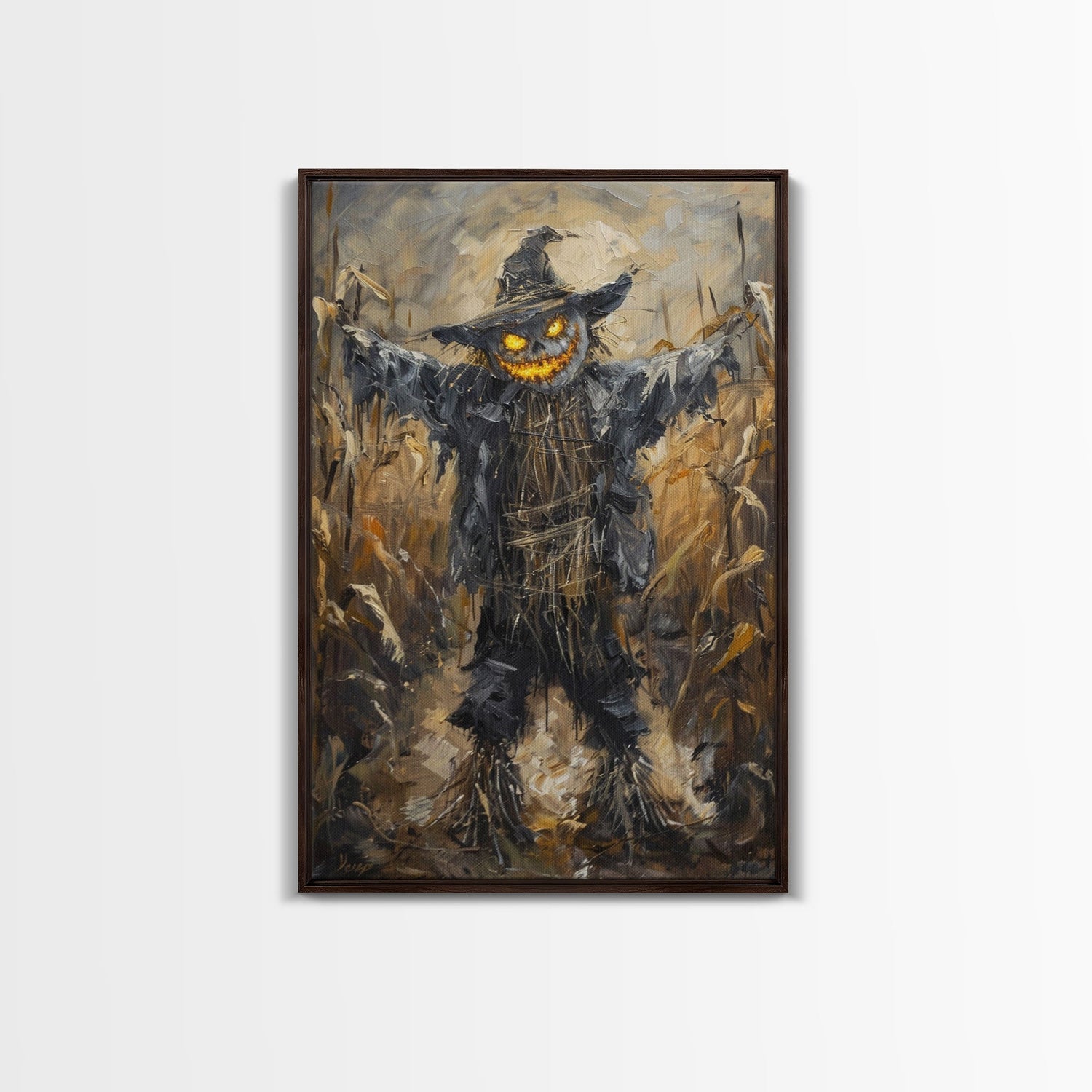 Sinister Scarecrow in Cornfield Framed Canvas Print | Halloween Horror Art | Spooky Farm Art | Creepy Scarecrow Art for Home Decoration