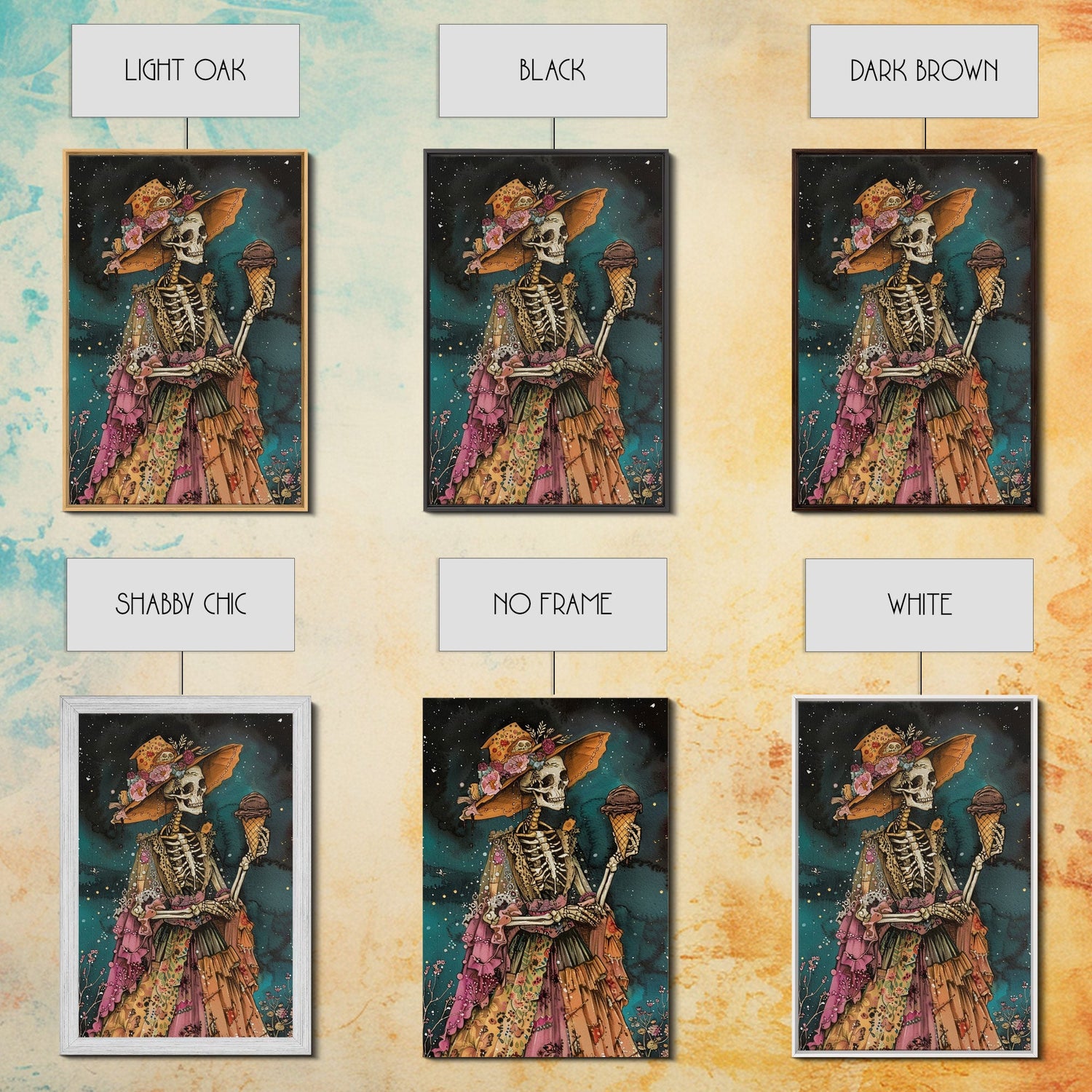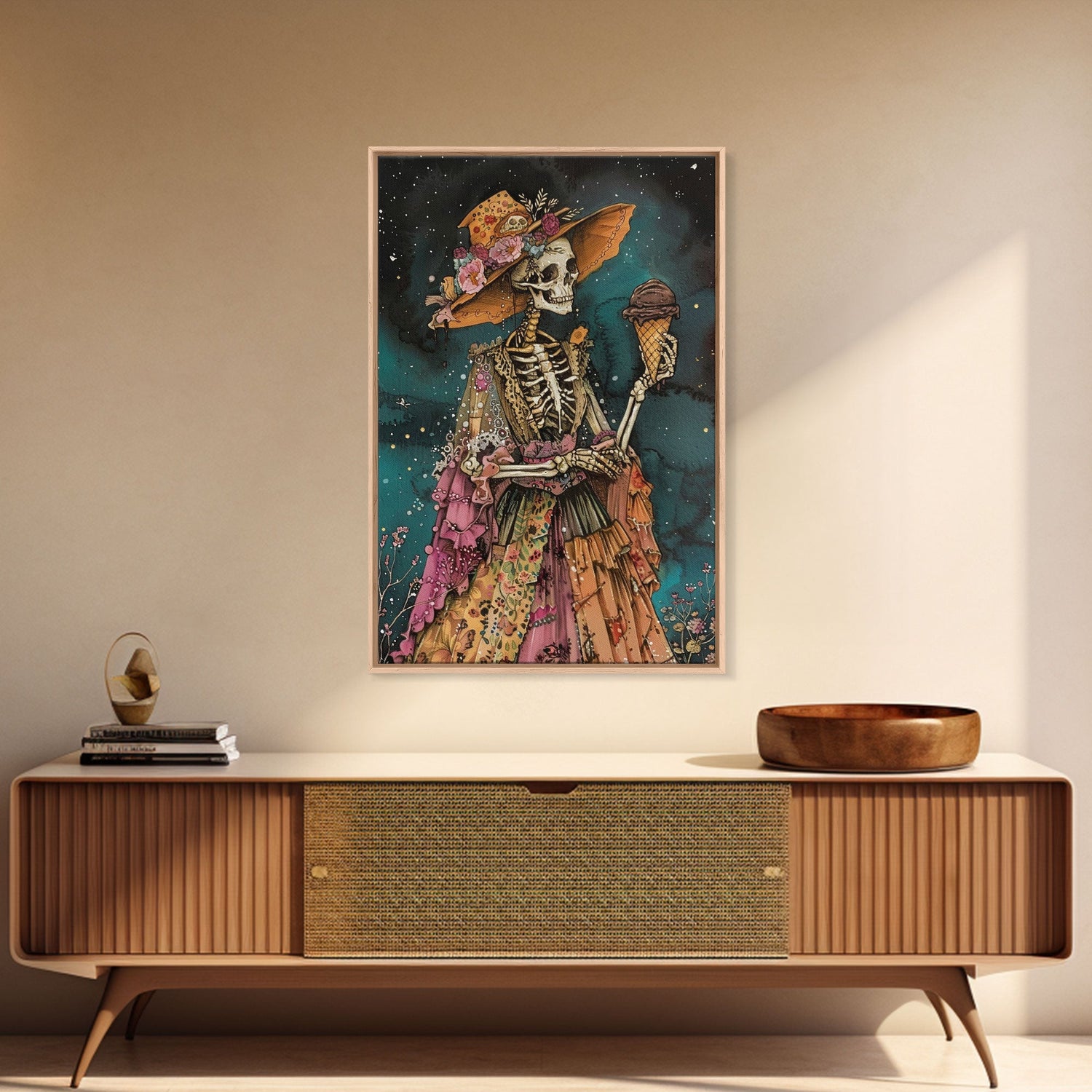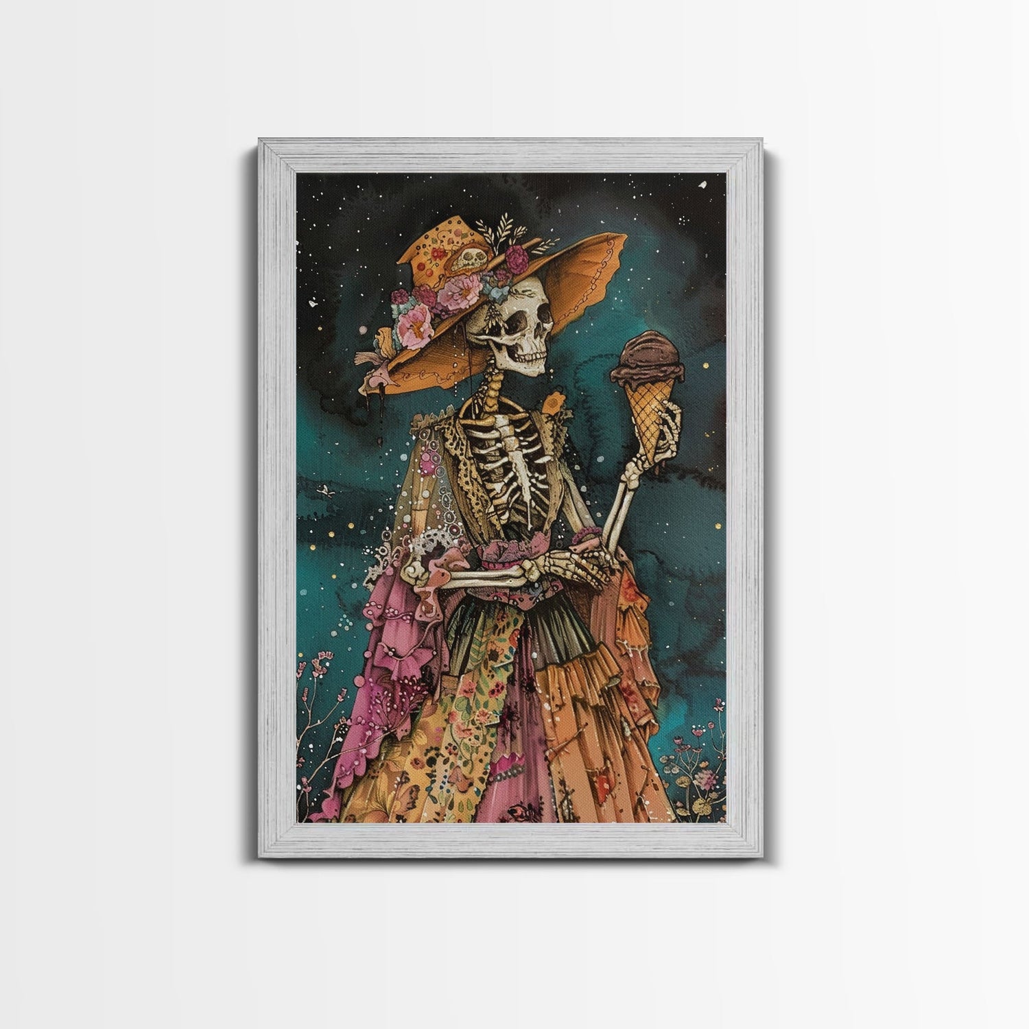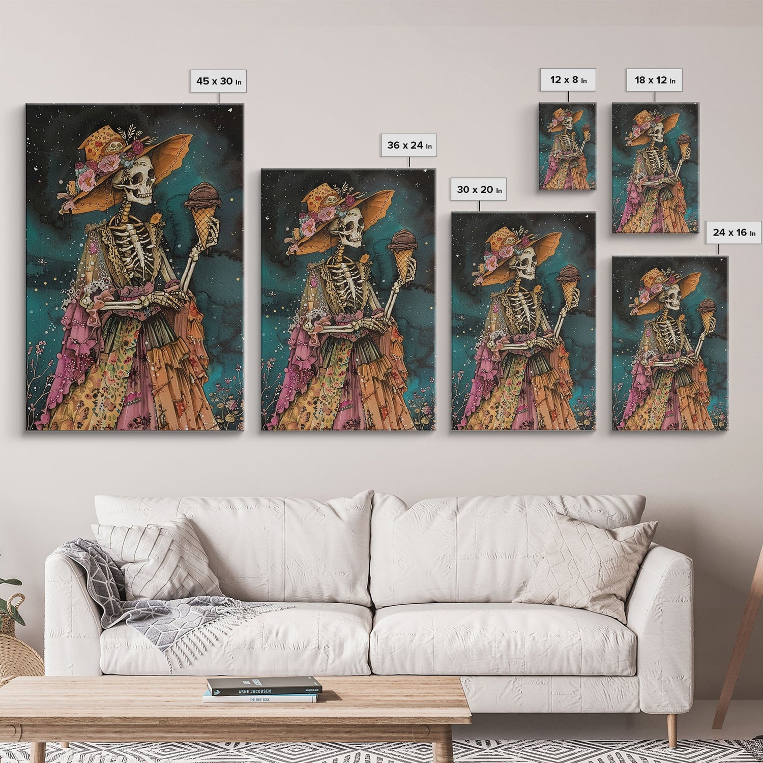 Skeleton in a Colorful Dress with Ice Cream - Day of the Dead Art - Halloween Skeleton Print Vibrant Skeleton Decor - Dia de los Muertos Art - 8x12 Inches / No Frame - Stretched Canvas Only is backordered and will ship as soon as it is back in stock.