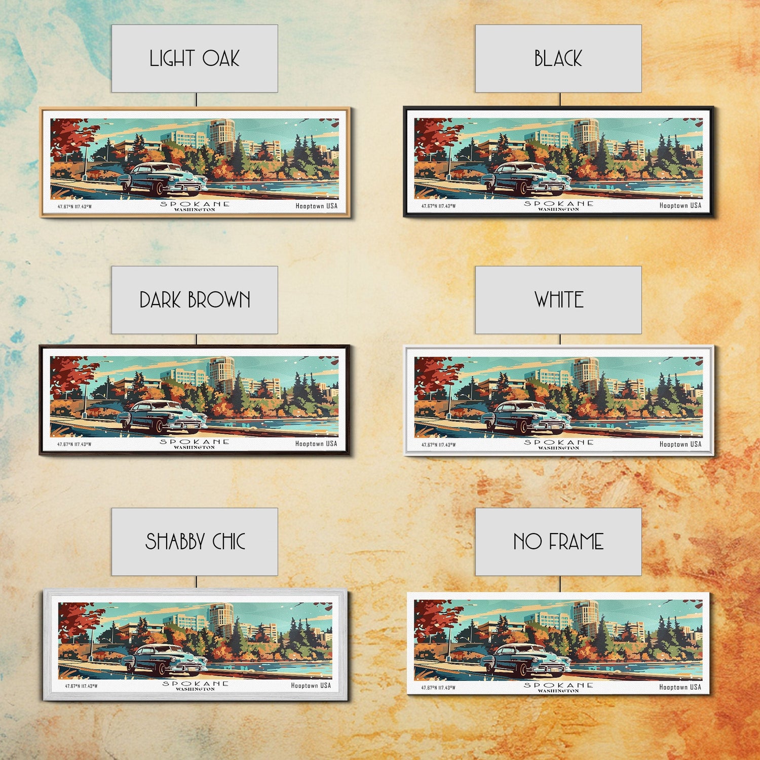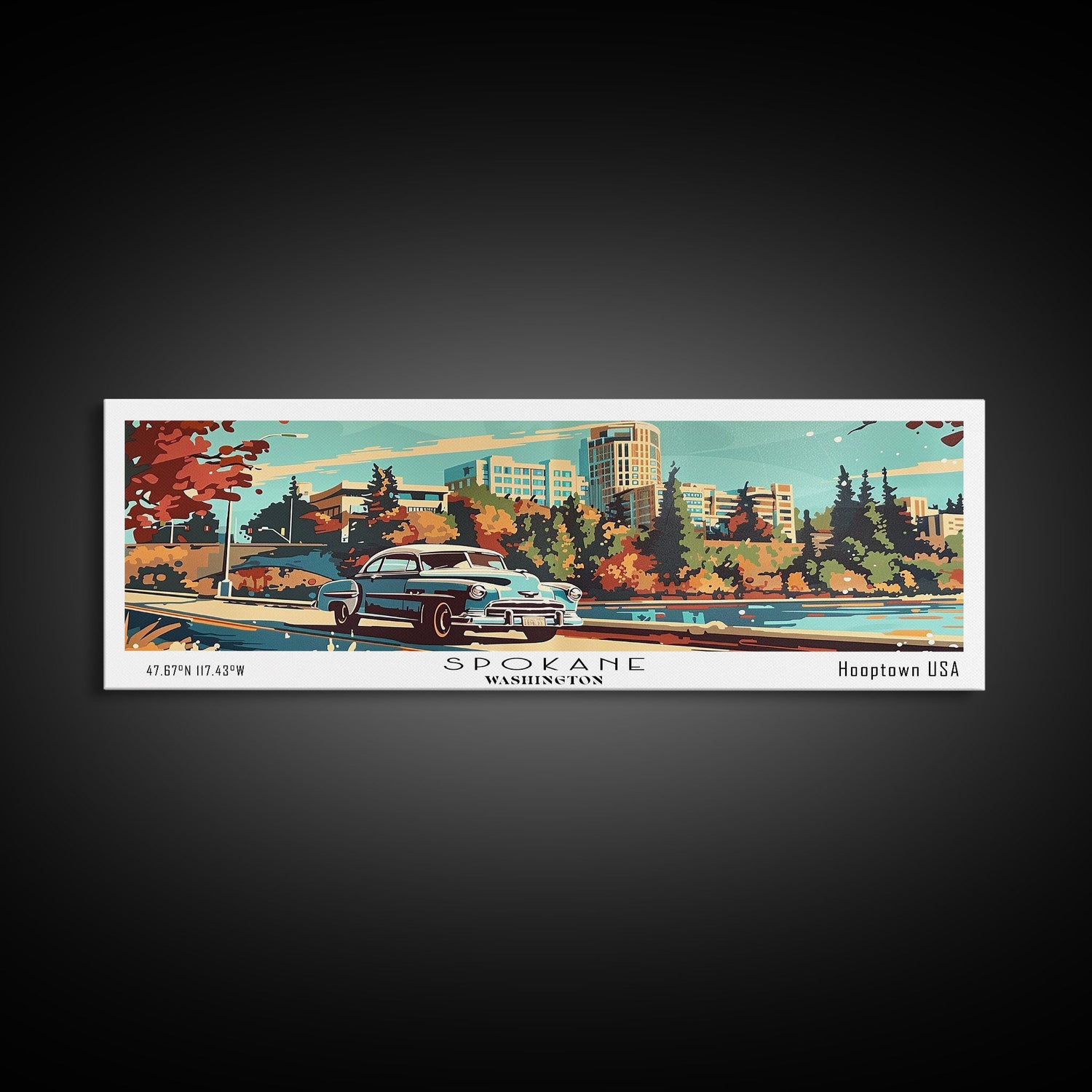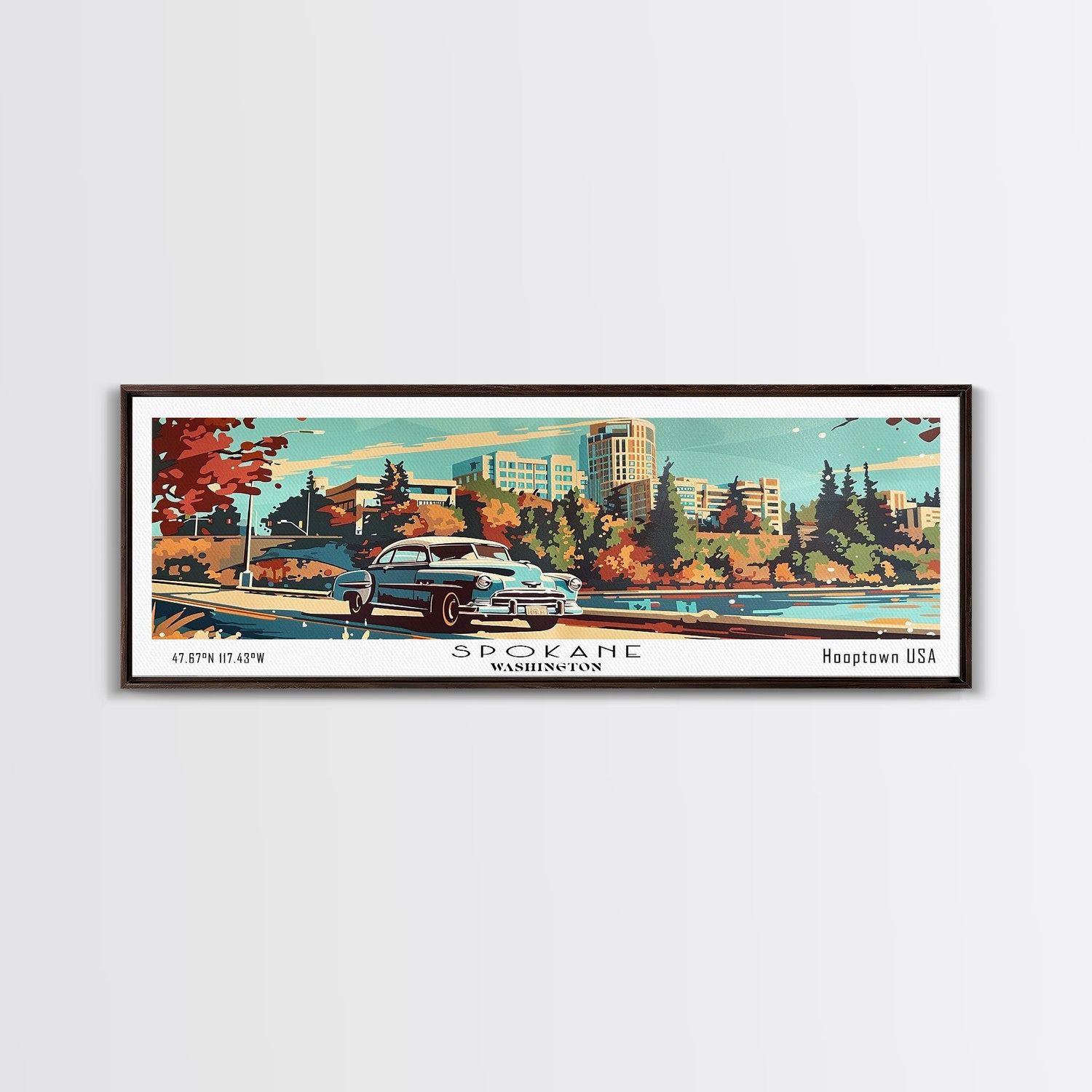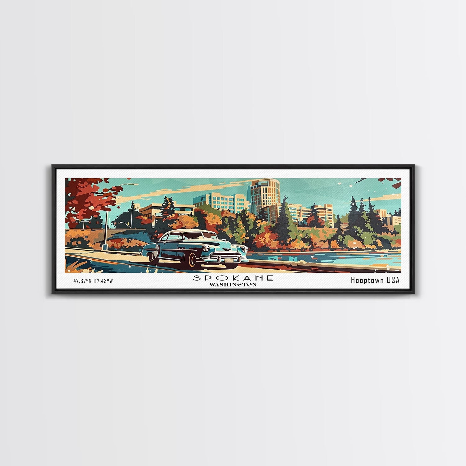 Spokane Washington Panoramic Wall Art, Mid Century Modern Framed Canvas Print, Retro Pop Art Travel Poster, Living Room and Office Decor