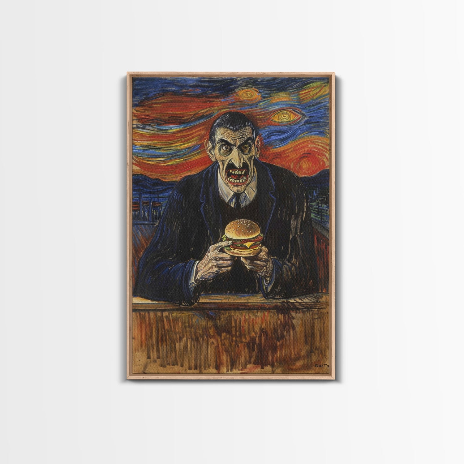 Spooky Artwork of a Man Eating a Hamburger, Inspired by the Scream, Ideal for Adding a Touch of Horror and Humor to Halloween Decor - 8x12 Inches / Gallery Wrap Canvas - Ready To Hang is backordered and will ship as soon as it is back in stock.