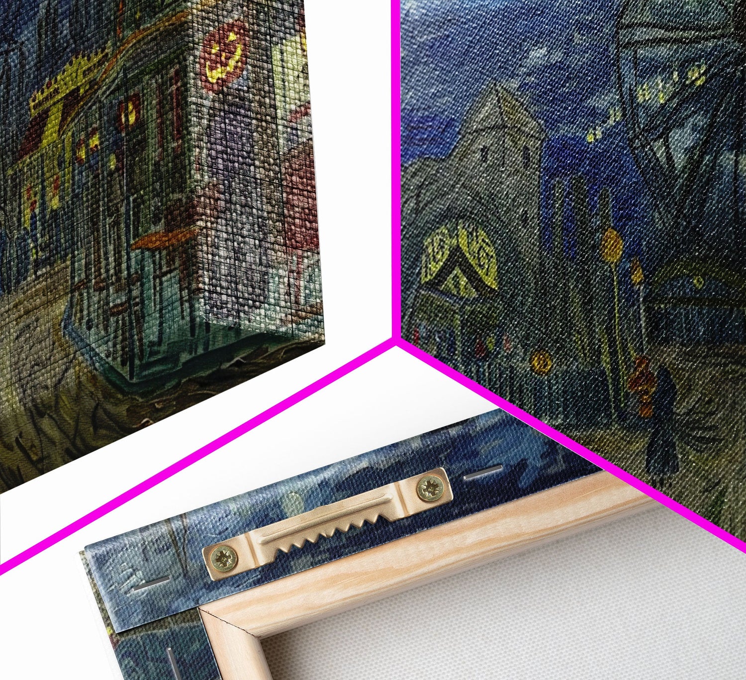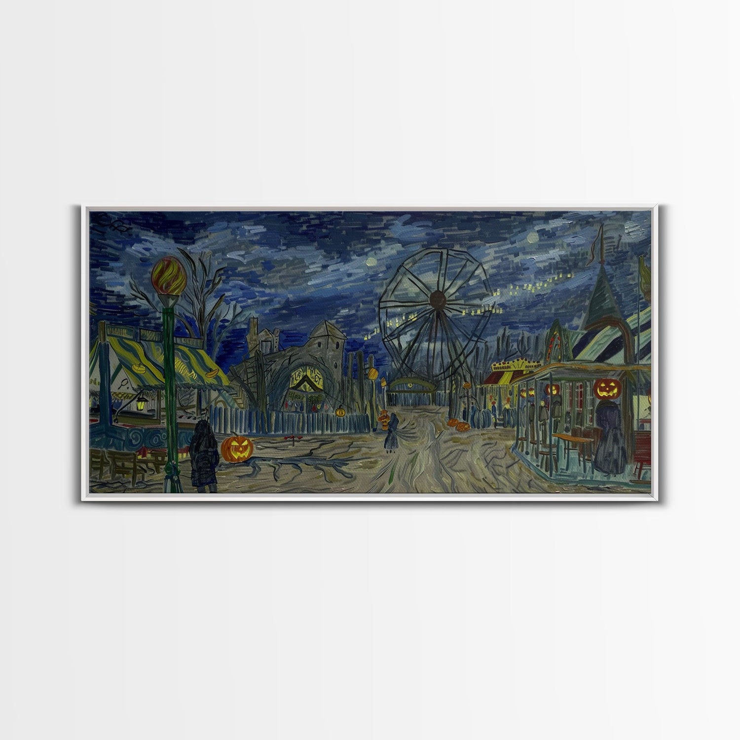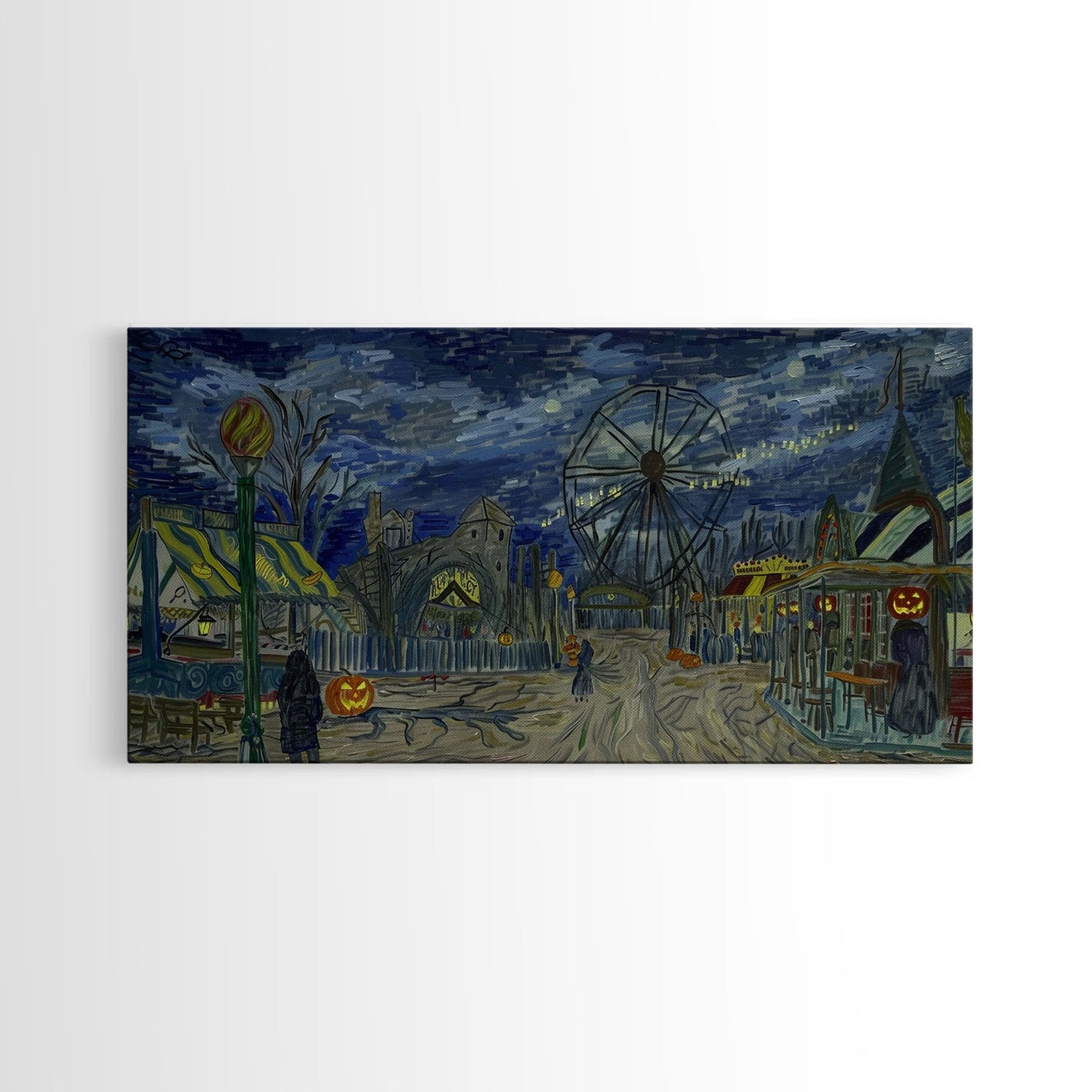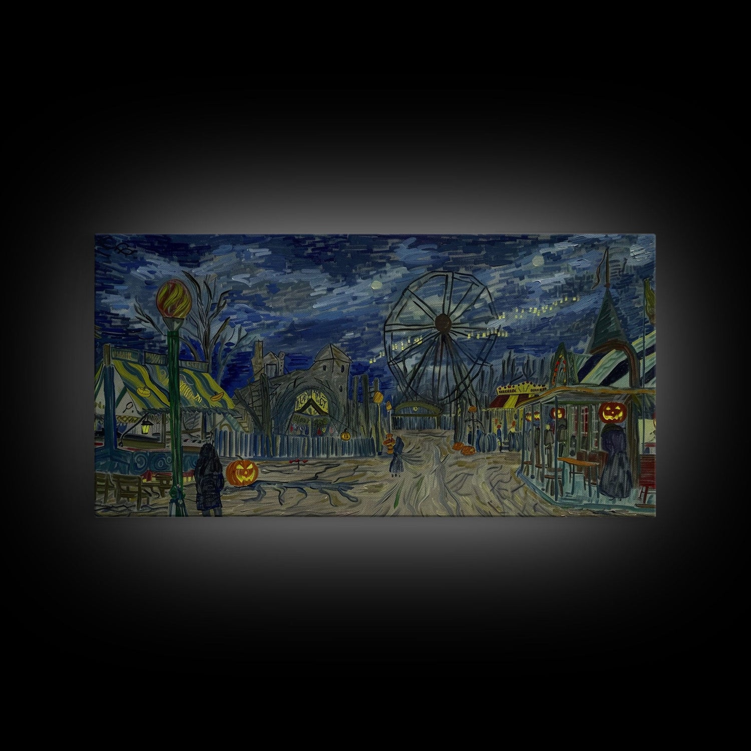 Spooky Haunted Carnival, Framed Canvas Print, Starry Night Inspired Spooky Season Wall Art, Halloween Prop - 10x20 Inches / No Frame - Stretched Canvas Only is backordered and will ship as soon as it is back in stock.