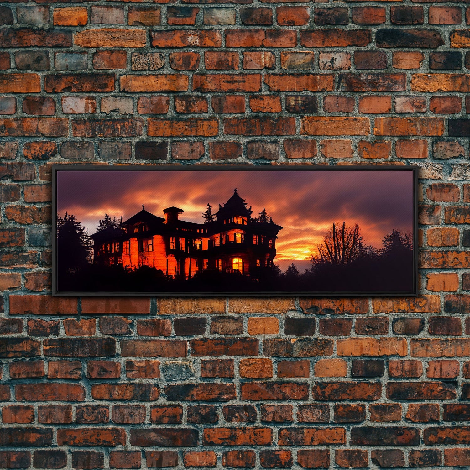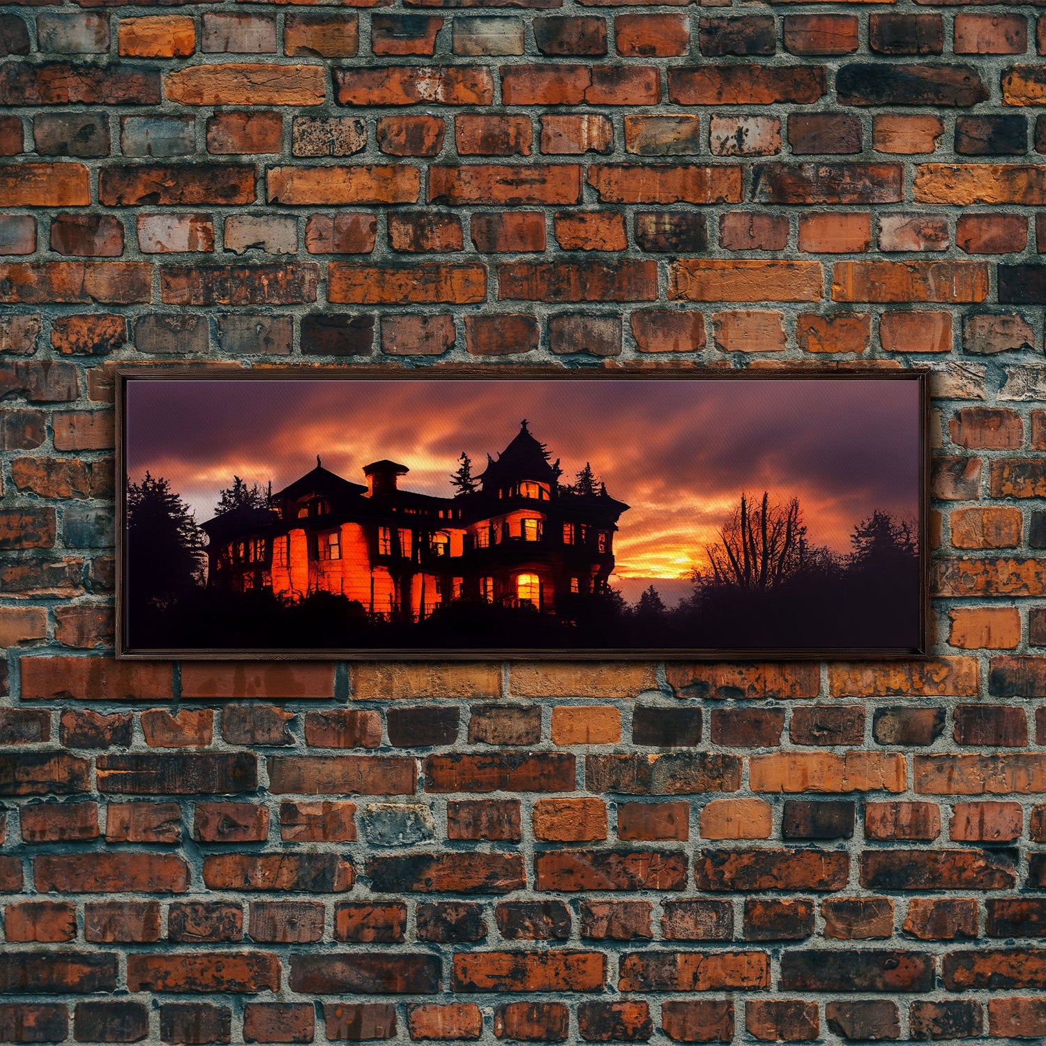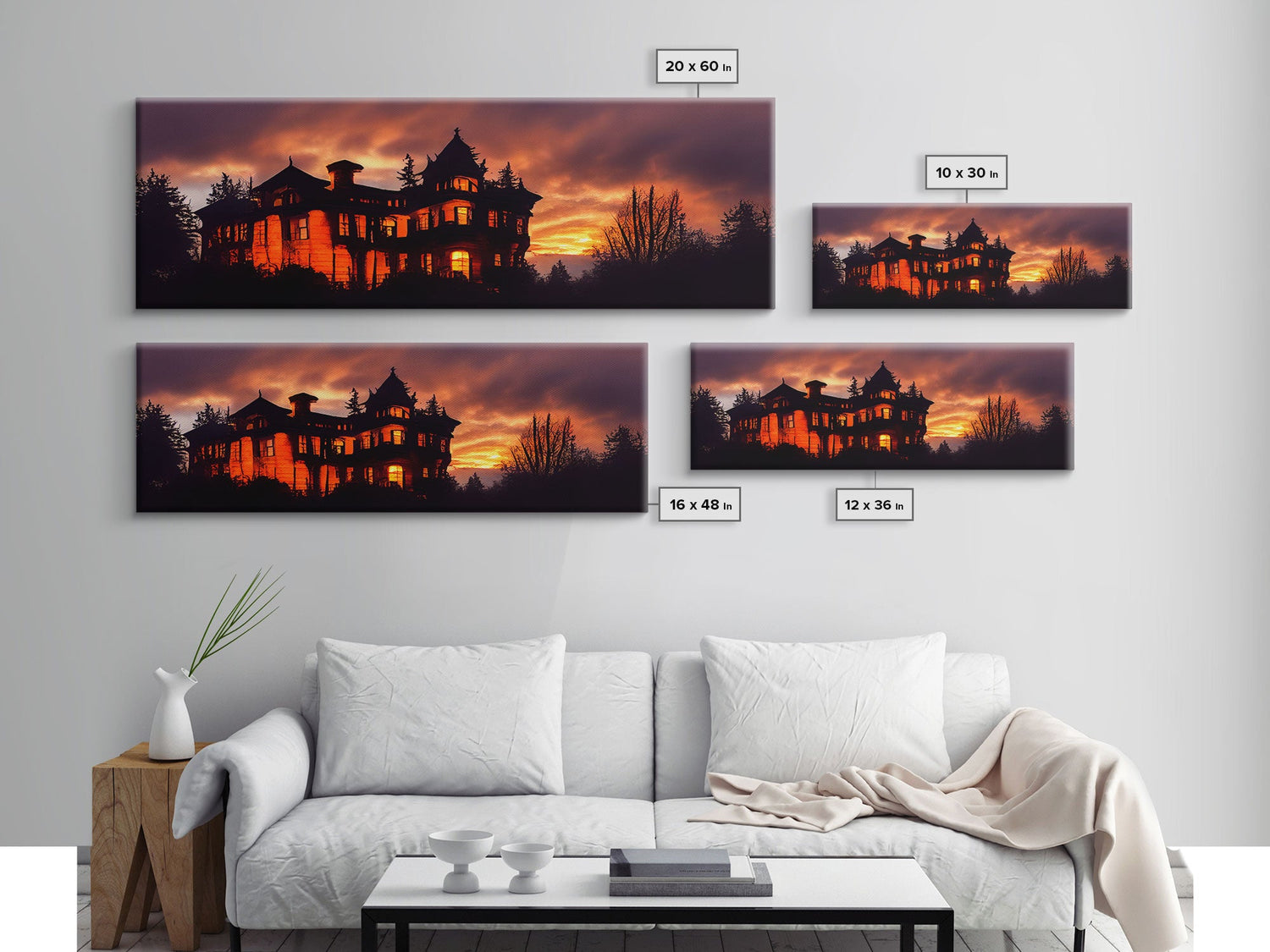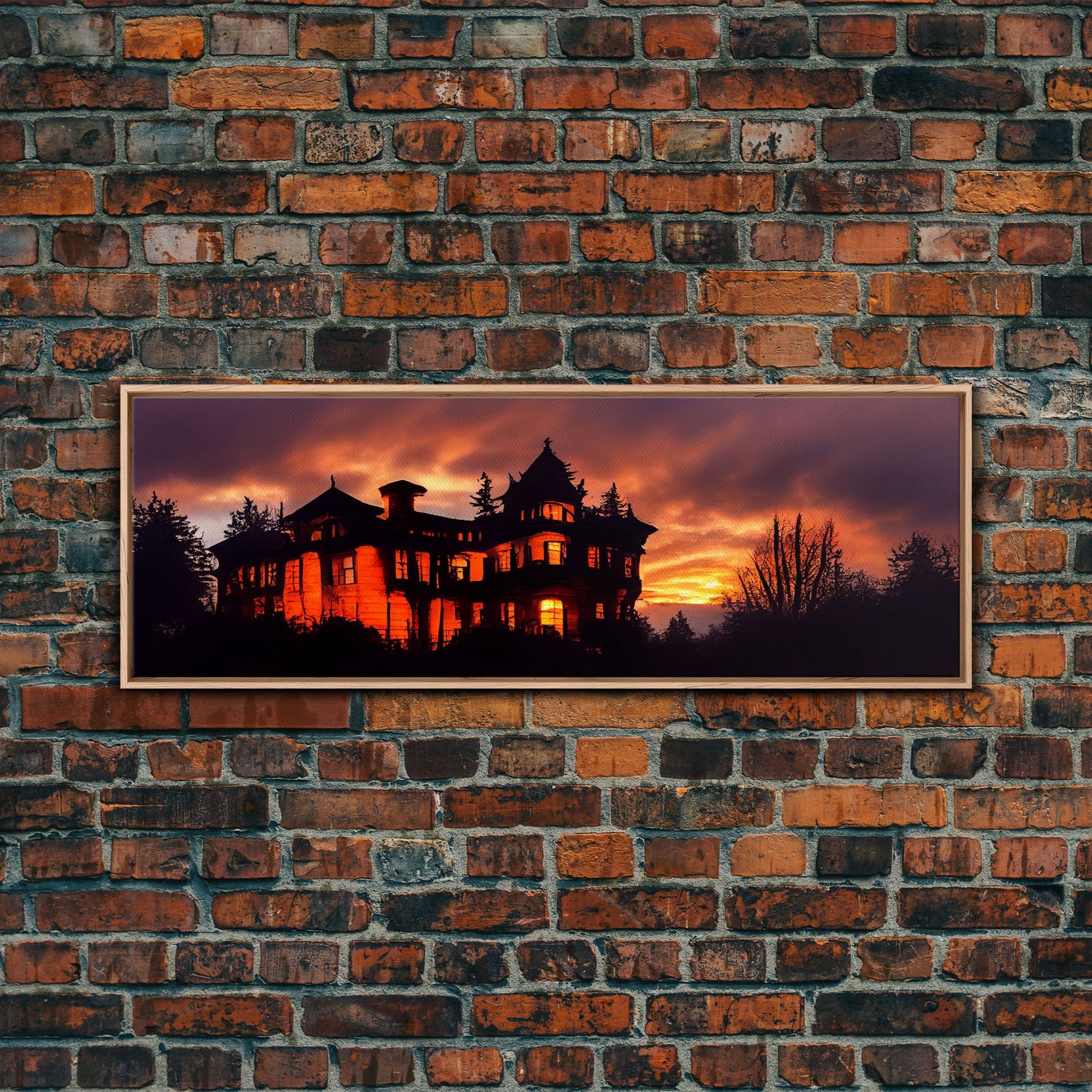 Spooky Haunted House, Panoramic Wall Art Canvas Print, Ready To Hang, Creepy Wall Decor, Gloomy Art