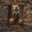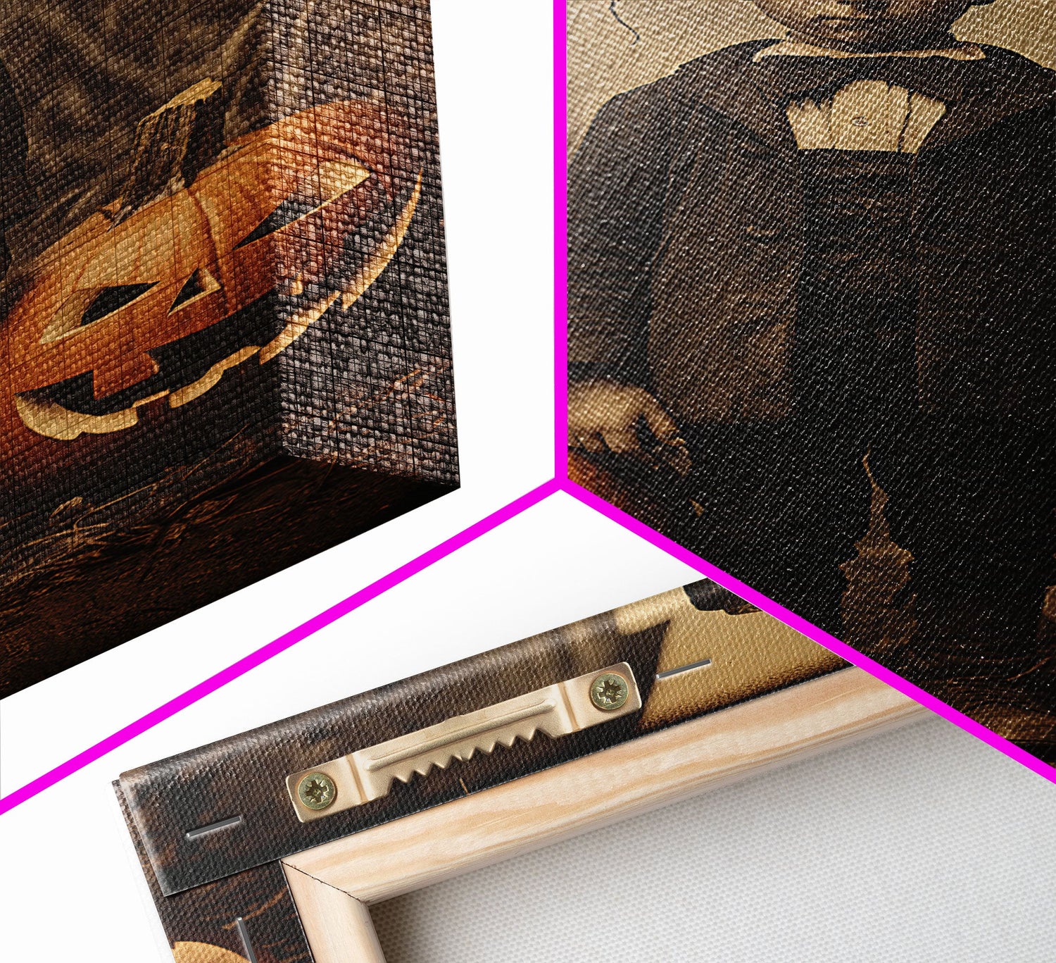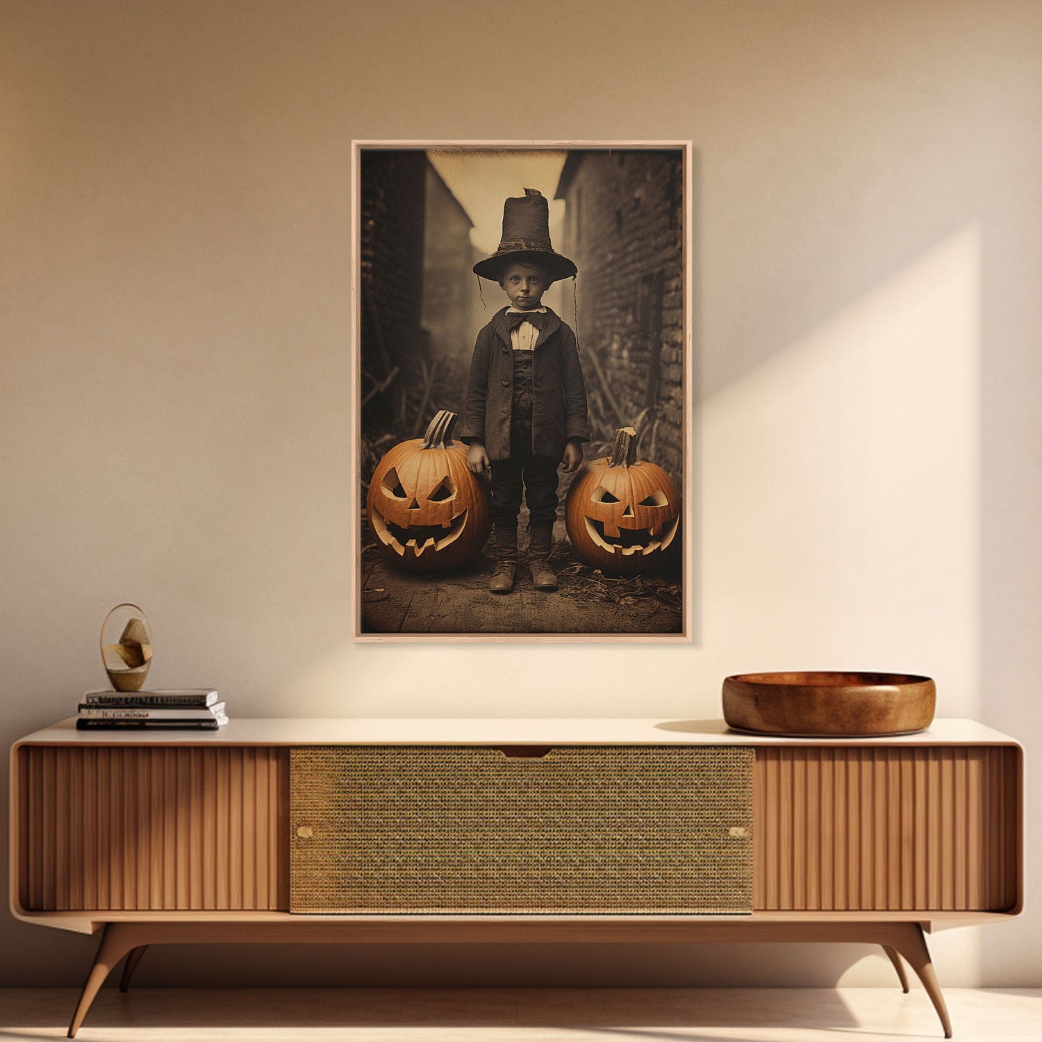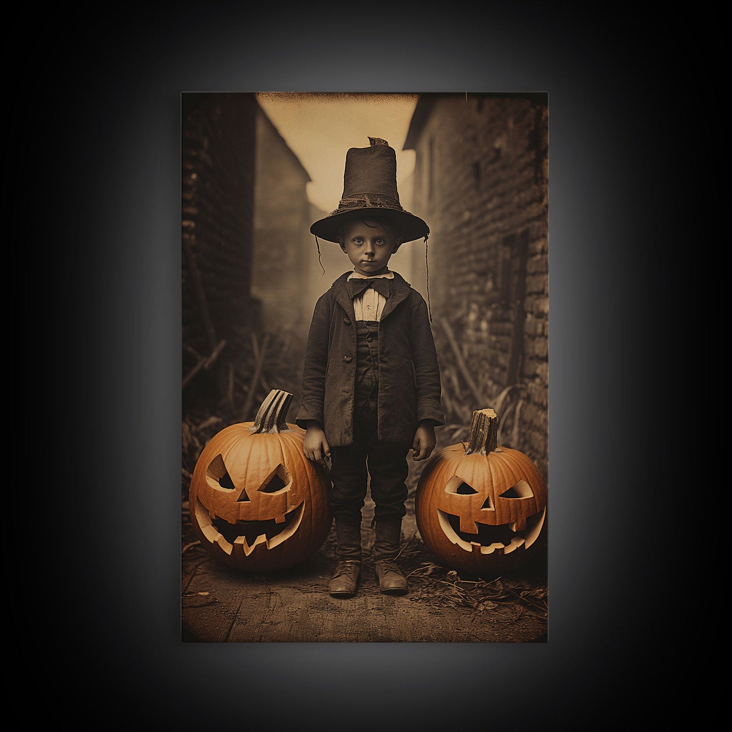 Spooky Victorian Tintype Photography, Framed Canvas Print, Halloween Art, Halloween Canvas, Pilgrim Boy and His Jack O' Lanterns