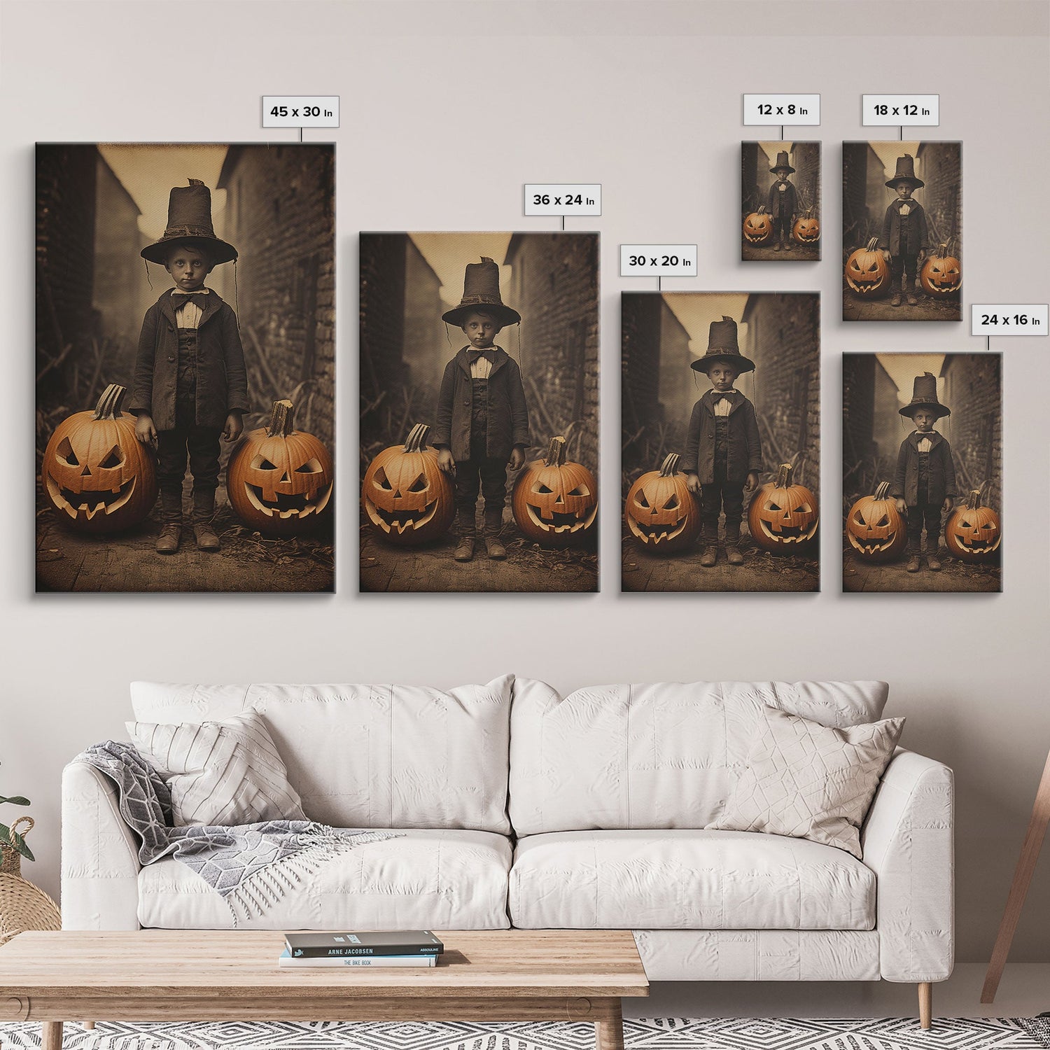 Spooky Victorian Tintype Photography, Framed Canvas Print, Halloween Art, Halloween Canvas, Pilgrim Boy and His Jack O' Lanterns - 8x12 Inches / No Frame - Stretched Canvas Only is backordered and will ship as soon as it is back in stock.