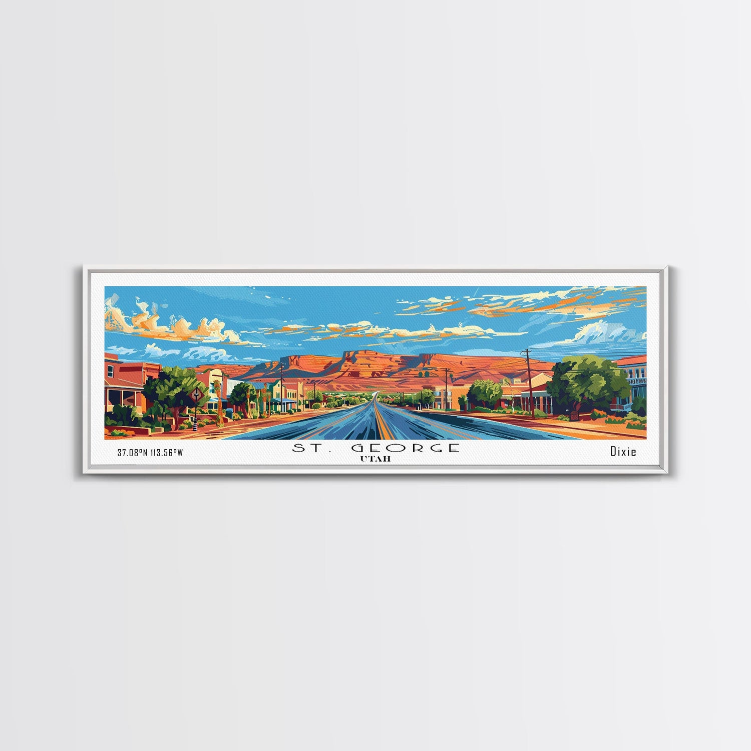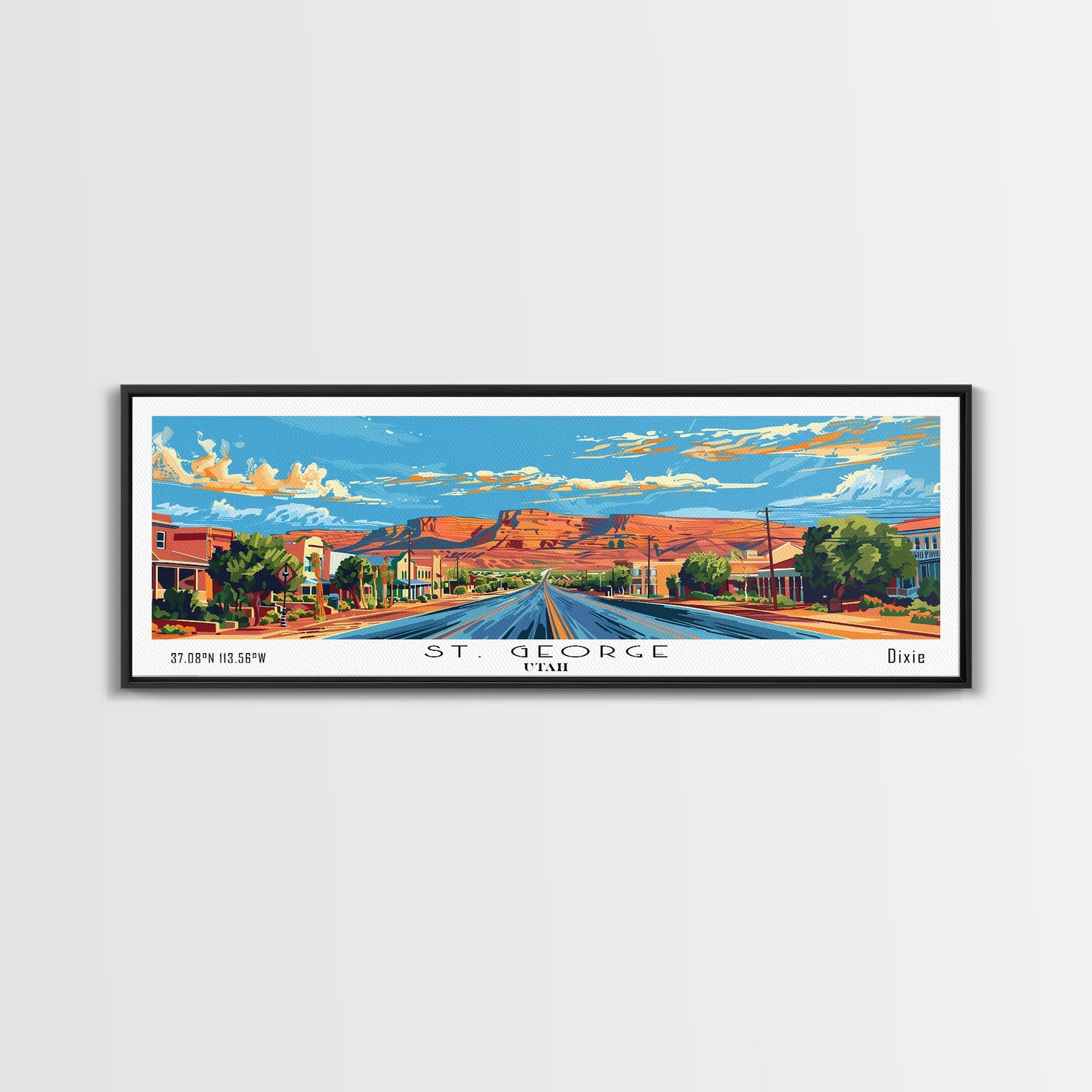 St. George Utah Panoramic Wall Art, Mid Century Modern Framed Canvas Print, Retro Pop Art Travel Poster, Office Wall Decor and Gift Idea