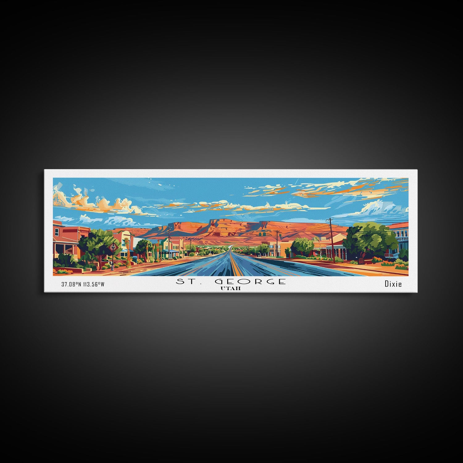 St. George Utah Panoramic Wall Art, Mid Century Modern Framed Canvas Print, Retro Pop Art Travel Poster, Office Wall Decor and Gift Idea - 10x30 Inches / No Frame - Stretched Canvas Only is backordered and will ship as soon as it is back in stock.