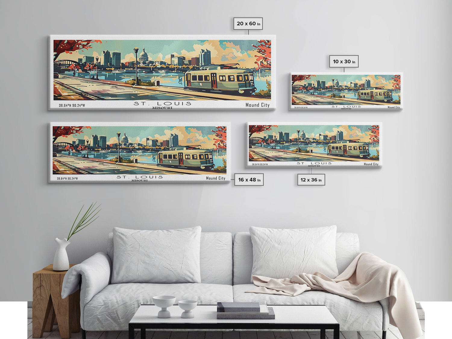 St. Louis Missouri Panoramic Painting, Mid Century Modern Framed Canvas Print, Retro Pop Art Travel Poster, Living Room Wall Art and Office Decor - 10x30 Inches / No Frame - Stretched Canvas Only is backordered and will ship as soon as it is back in stock.