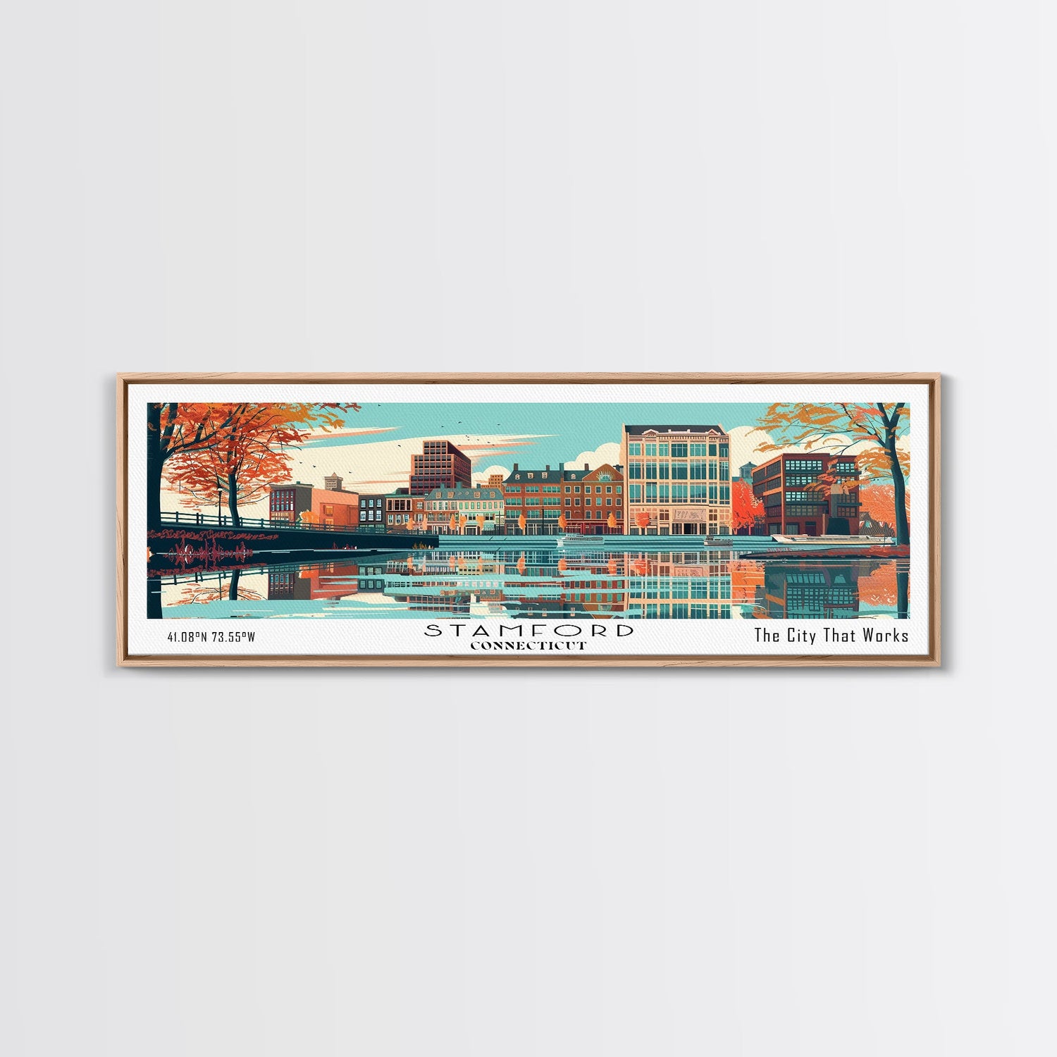 Stamford Connecticut Panoramic Painting, Mid Century Modern Framed Canvas Print, Retro Pop Art Travel Poster, Wall Hanging for Home Decor