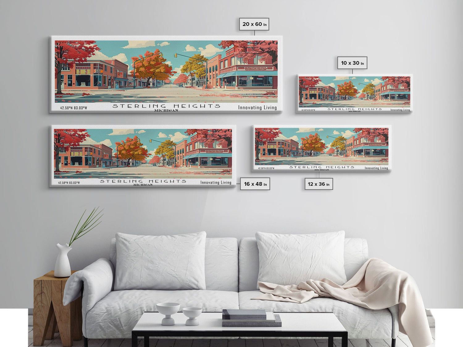 Sterling Heights Michigan Panoramic Art, Mid Century Modern Framed Canvas Print, Retro Pop Art Travel Poster, Office Wall Art, Home Decoration
