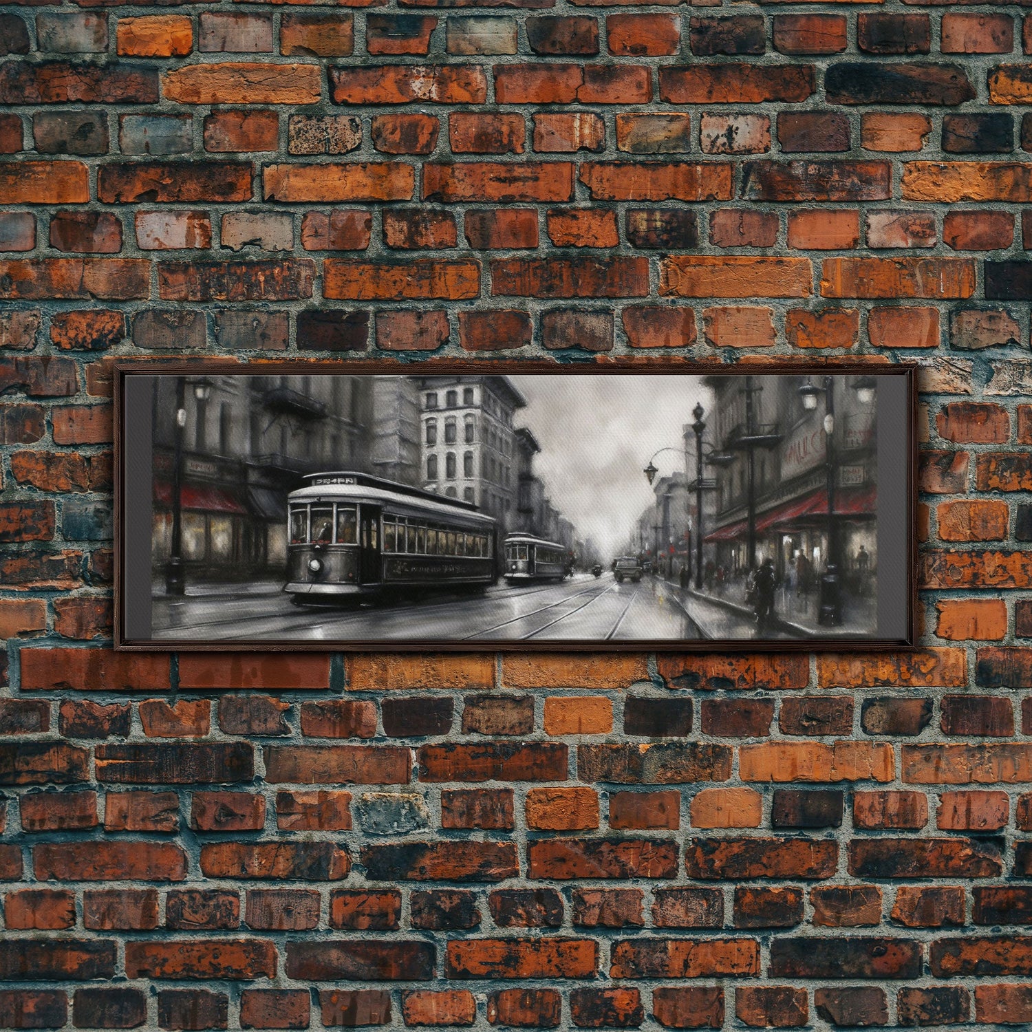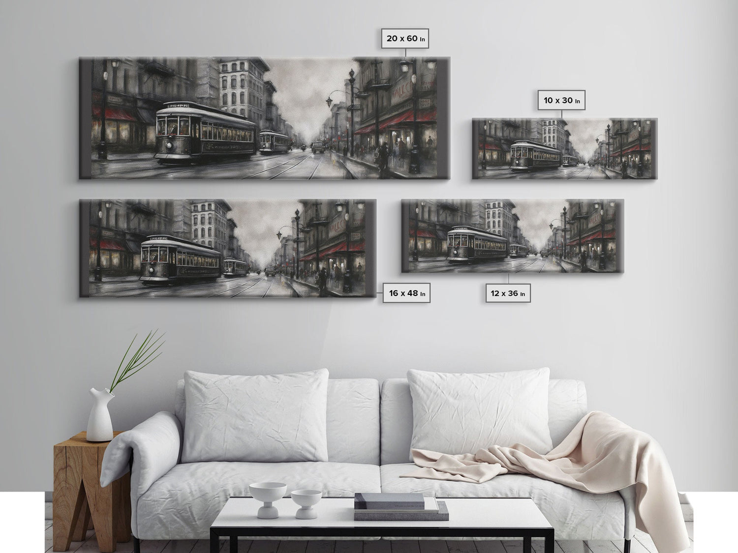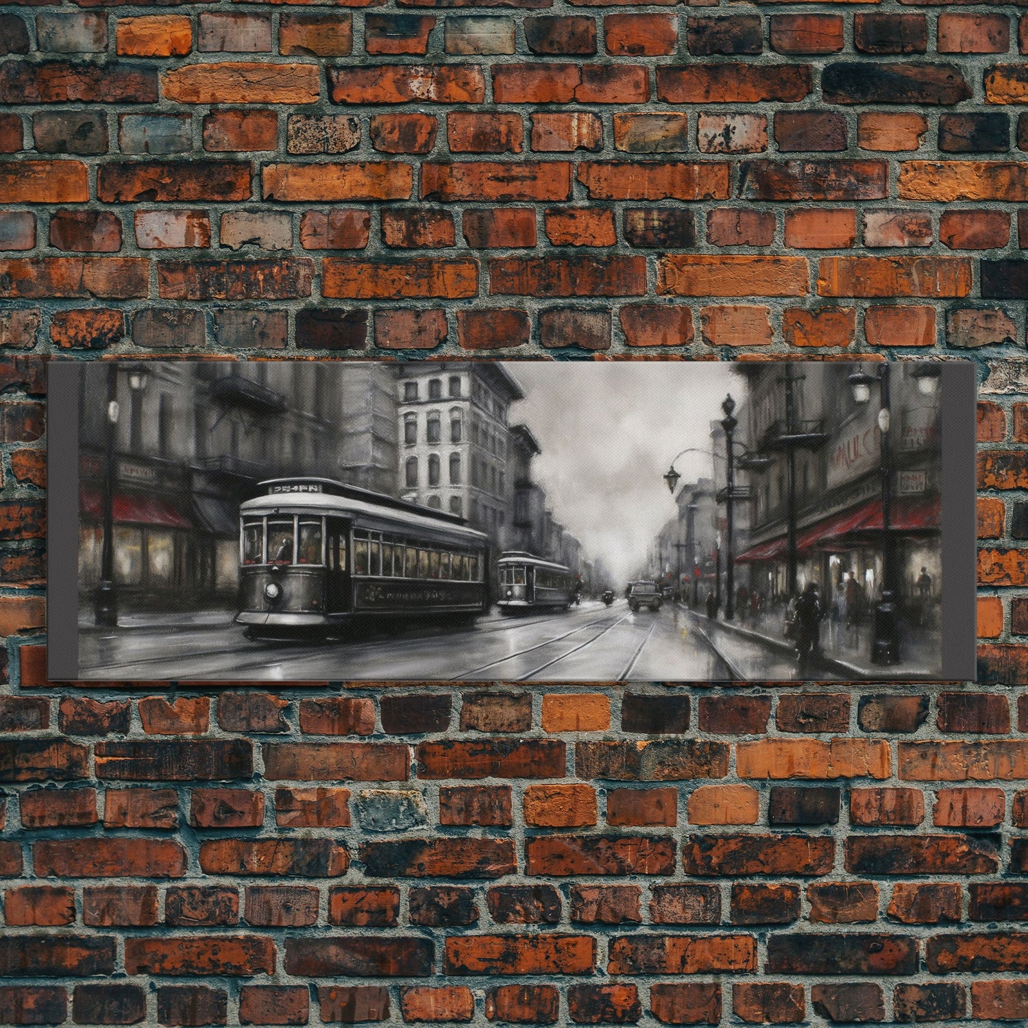 Streetcars In The City Canvas Print, Vintage Art, People On Sidewalk, City Art, Large Urban Art Print, Panoramic, Wall Art, Canvas Print - 10x30 Inches / No Frame - Stretched Canvas Only is backordered and will ship as soon as it is back in stock.