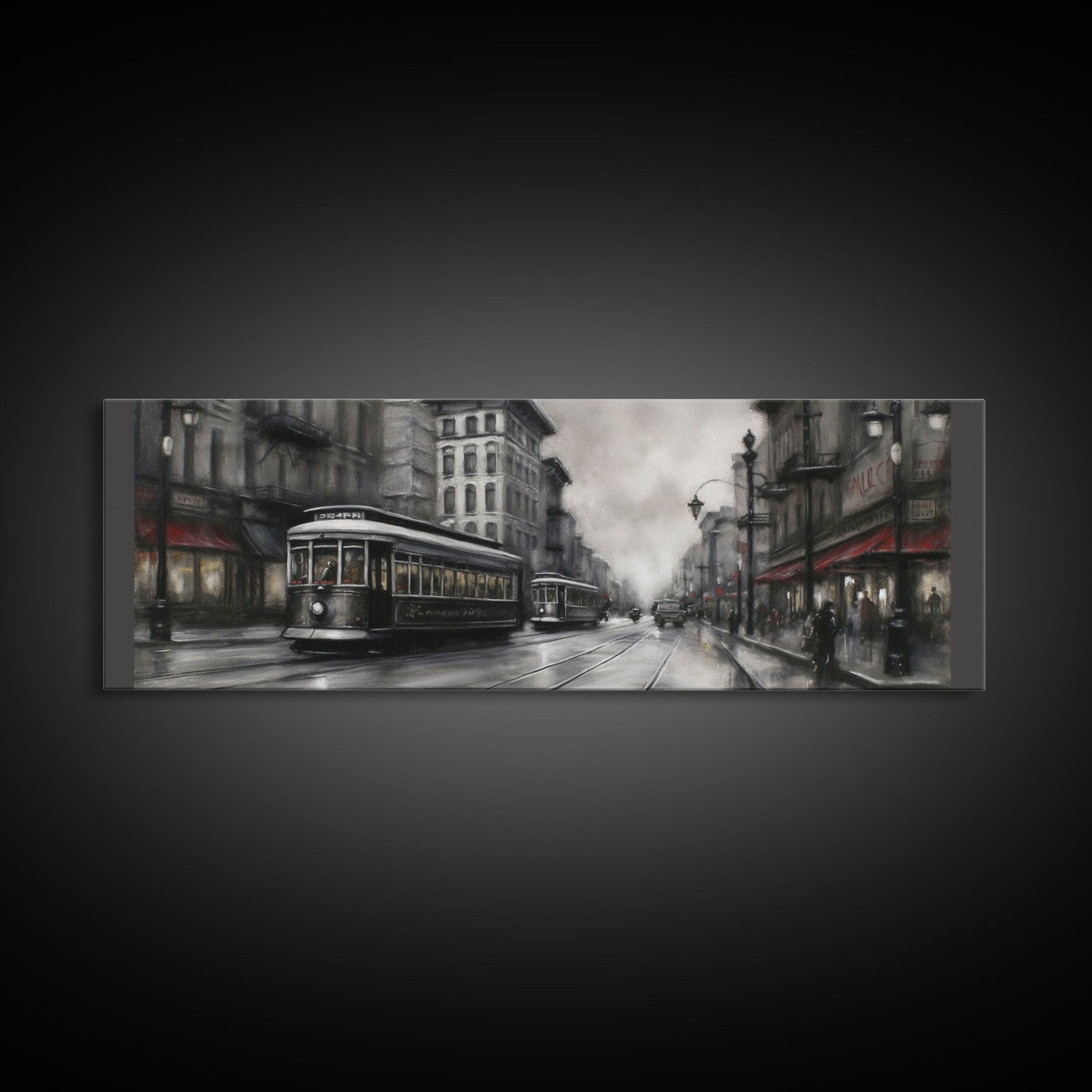 Streetcars In The City Canvas Print, Vintage Art, People On Sidewalk, City Art, Large Urban Art Print, Panoramic, Wall Art, Canvas Print