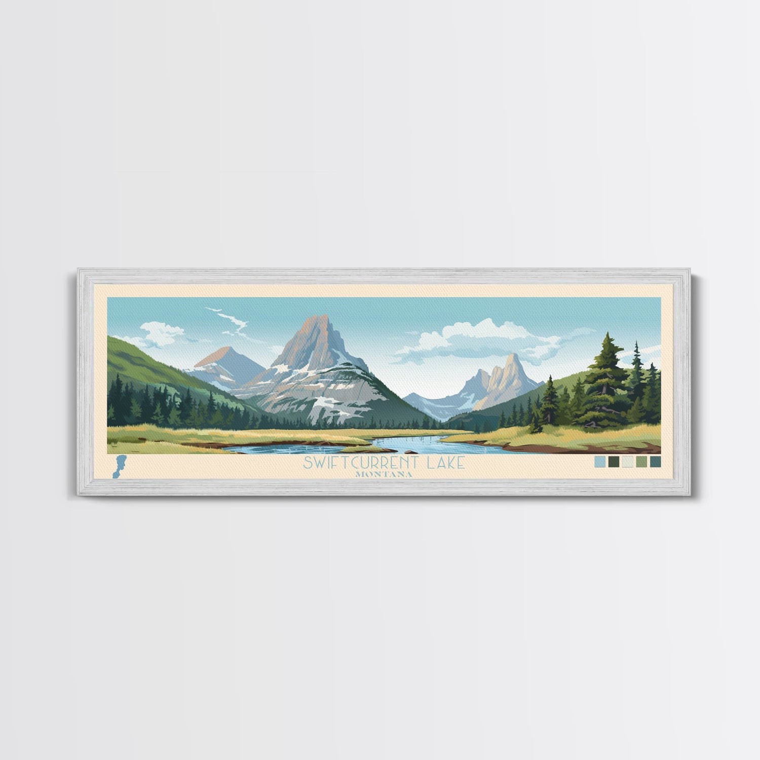 Swiftcurrent Lake, Montana Framed Canvas Print, Lake House Decor, Midcentury Modern Art, Pop Art, Travel Poster, Bedroom Wall Art - 10x30 Inches / No Frame - Stretched Canvas Only is backordered and will ship as soon as it is back in stock.
