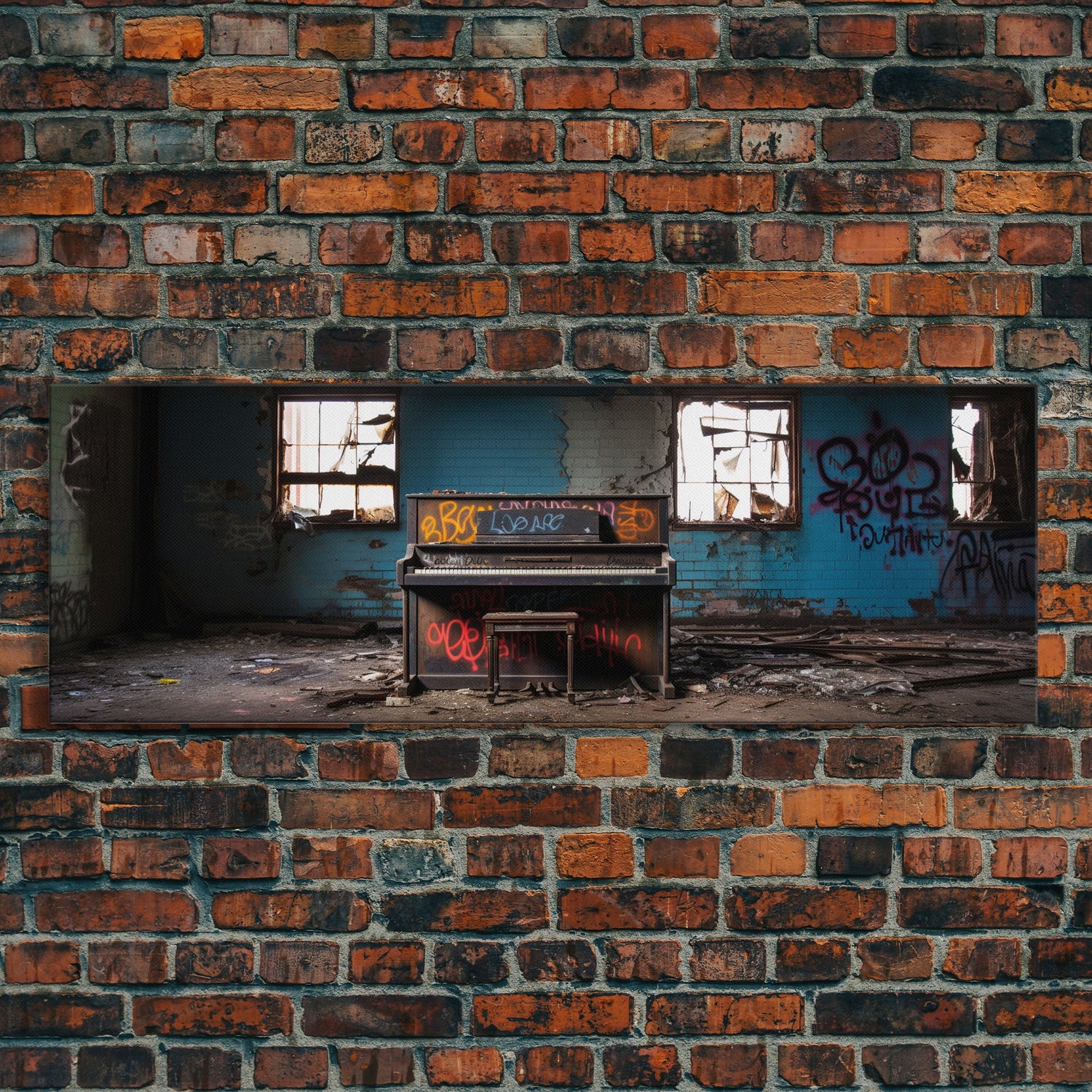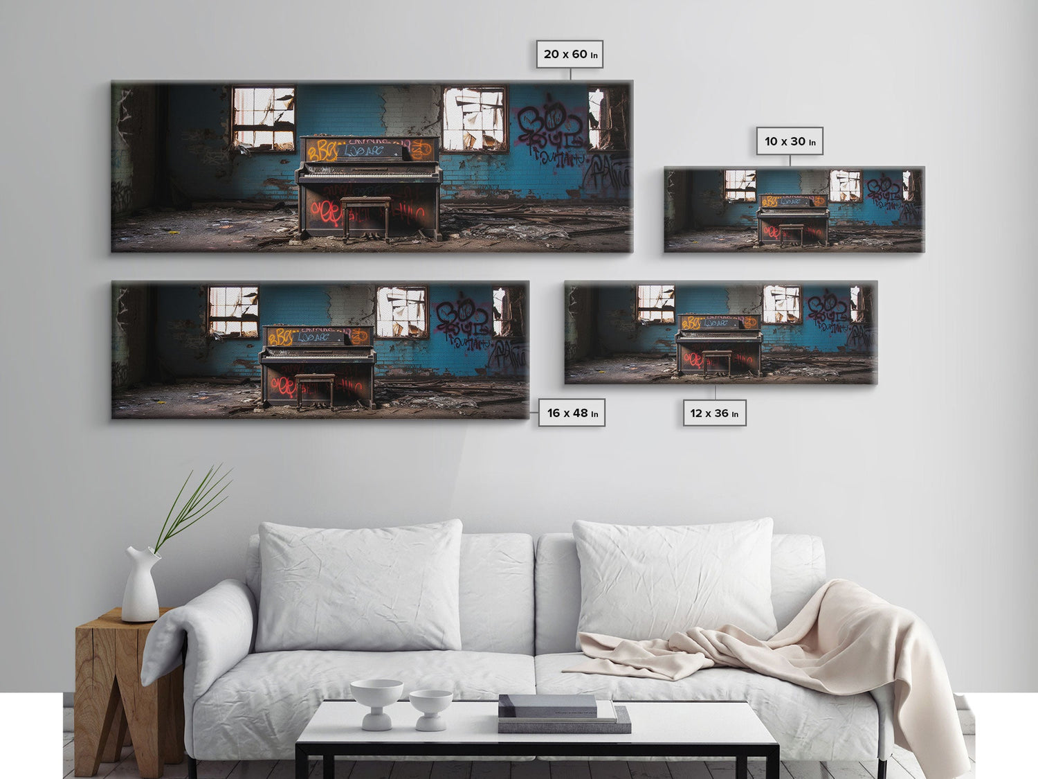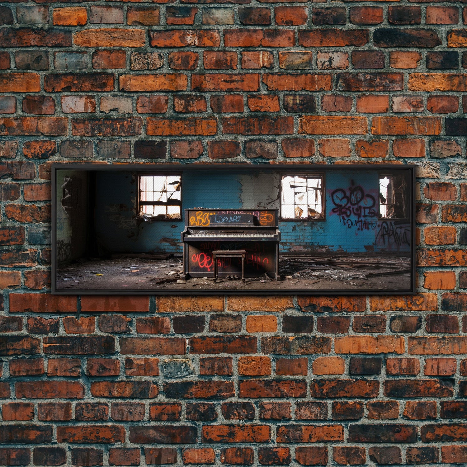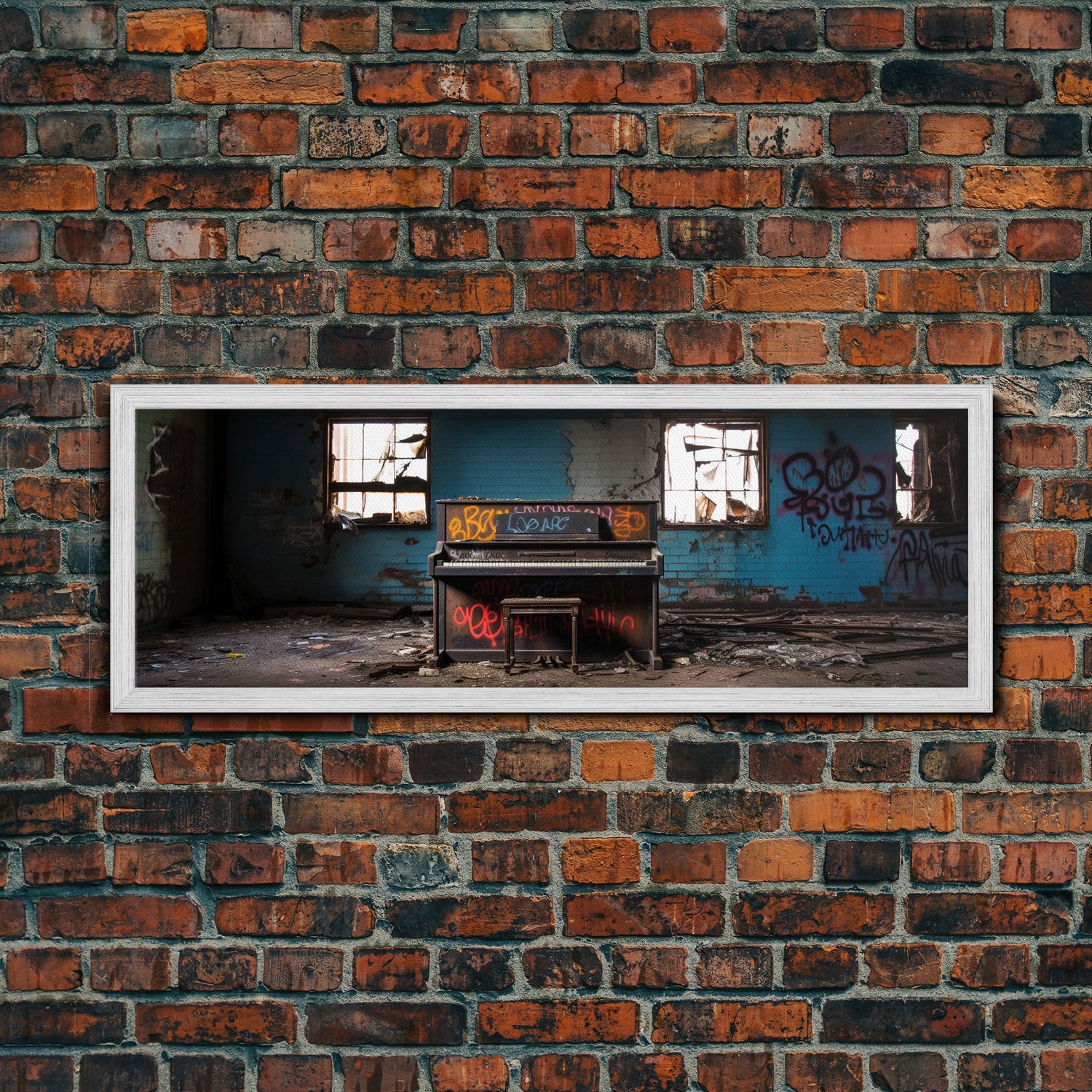 The Abandoned Piano, Urban Decay Art, Street Art, Framed Canvas Print, Graffiti Art, Panoramic Wall Art