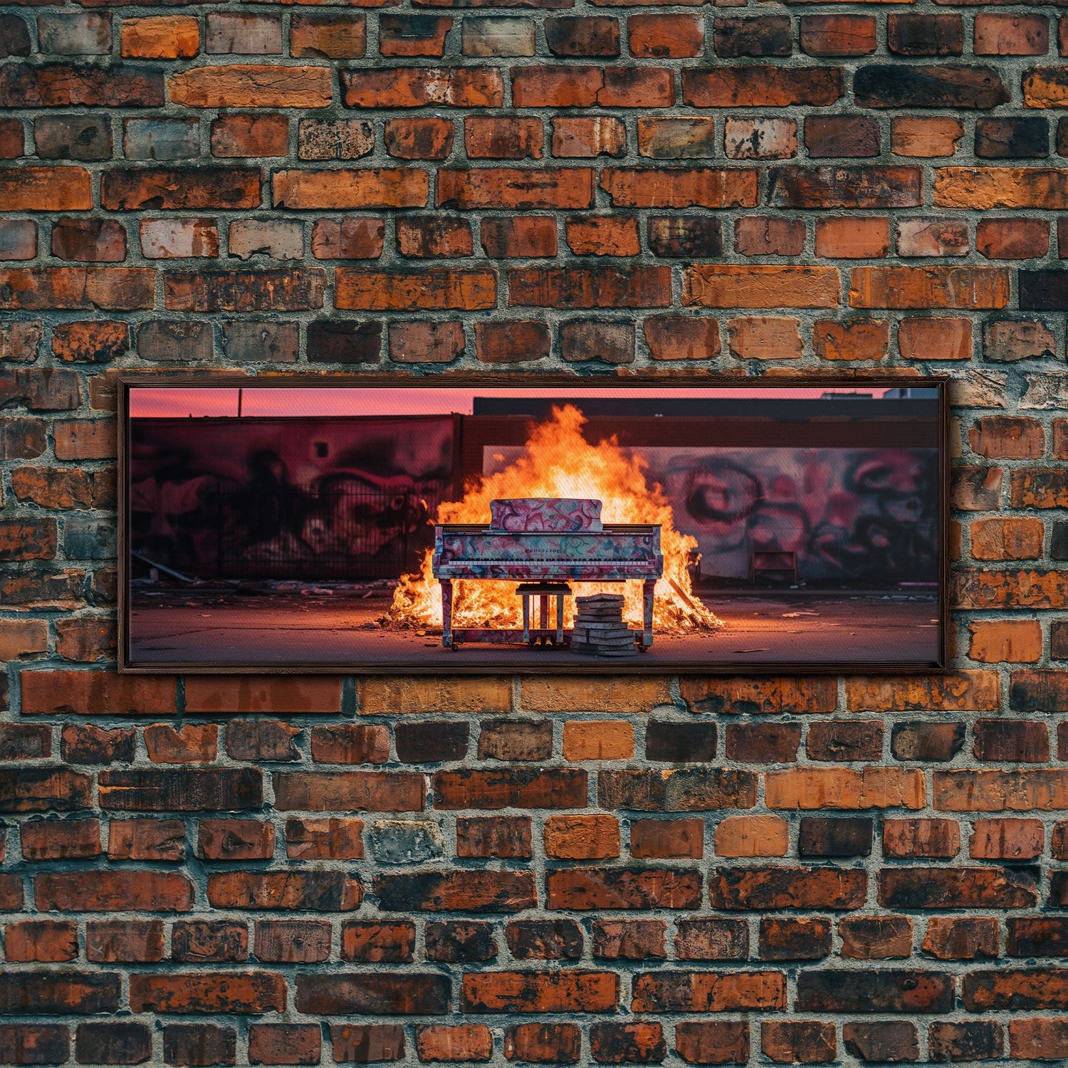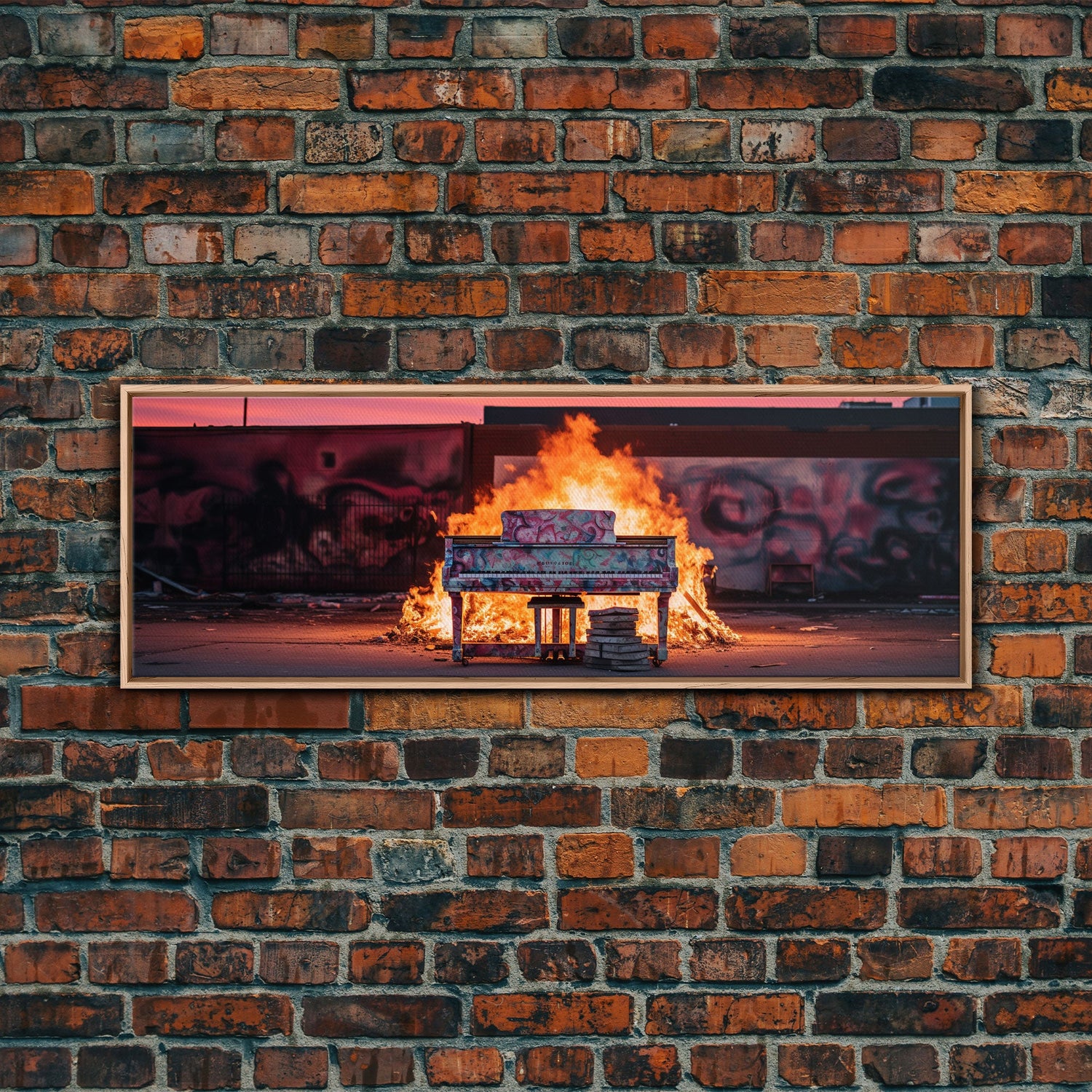 The Burning Piano, Urban Decay Art, Street Art, Framed Canvas Print, Graffiti Art, Panoramic Wall Art