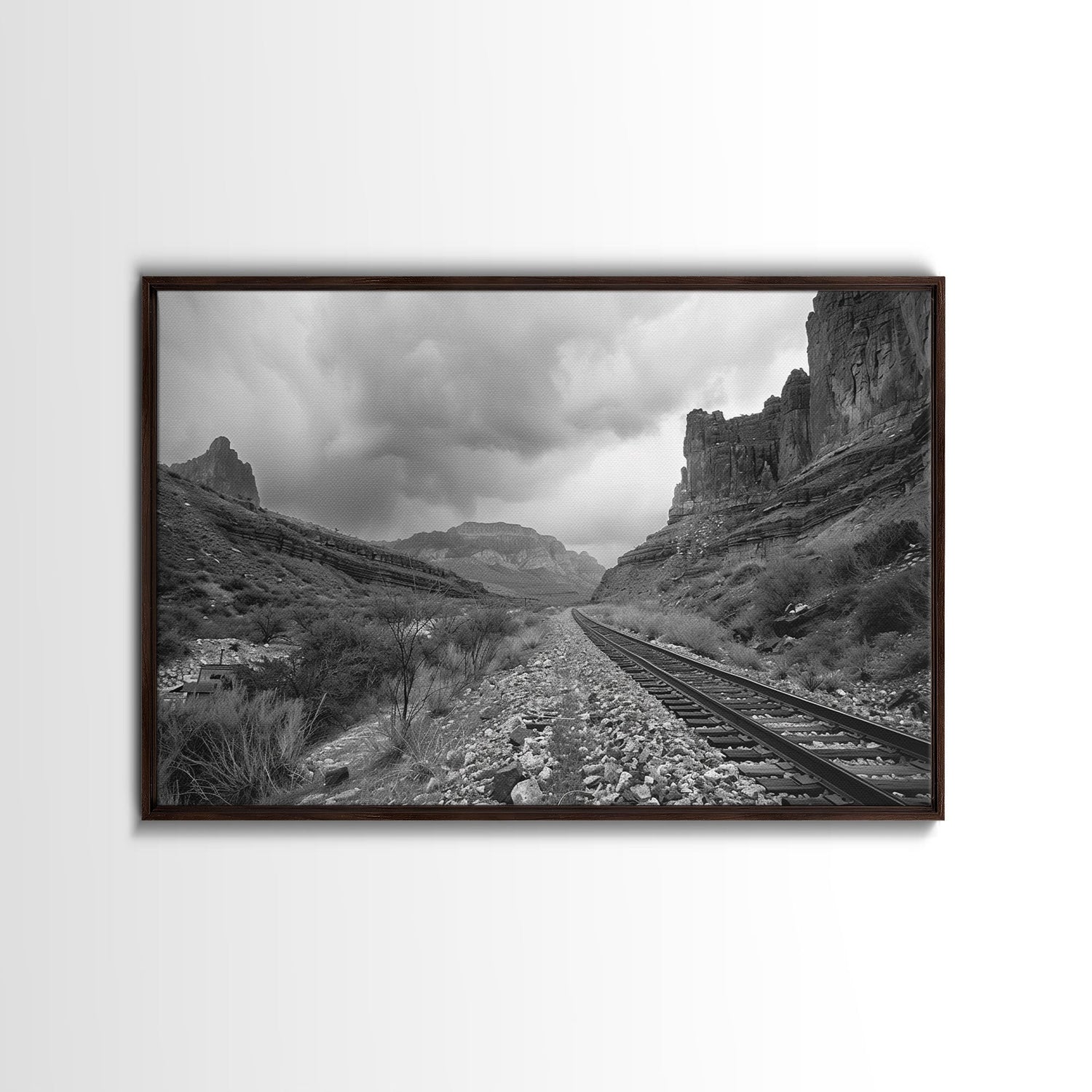 The Train Tracks, Framed Canvas Print, Black and White Western Photography, Wild West Art, Metal Art, Metal Print, Rustic Country Wall Art