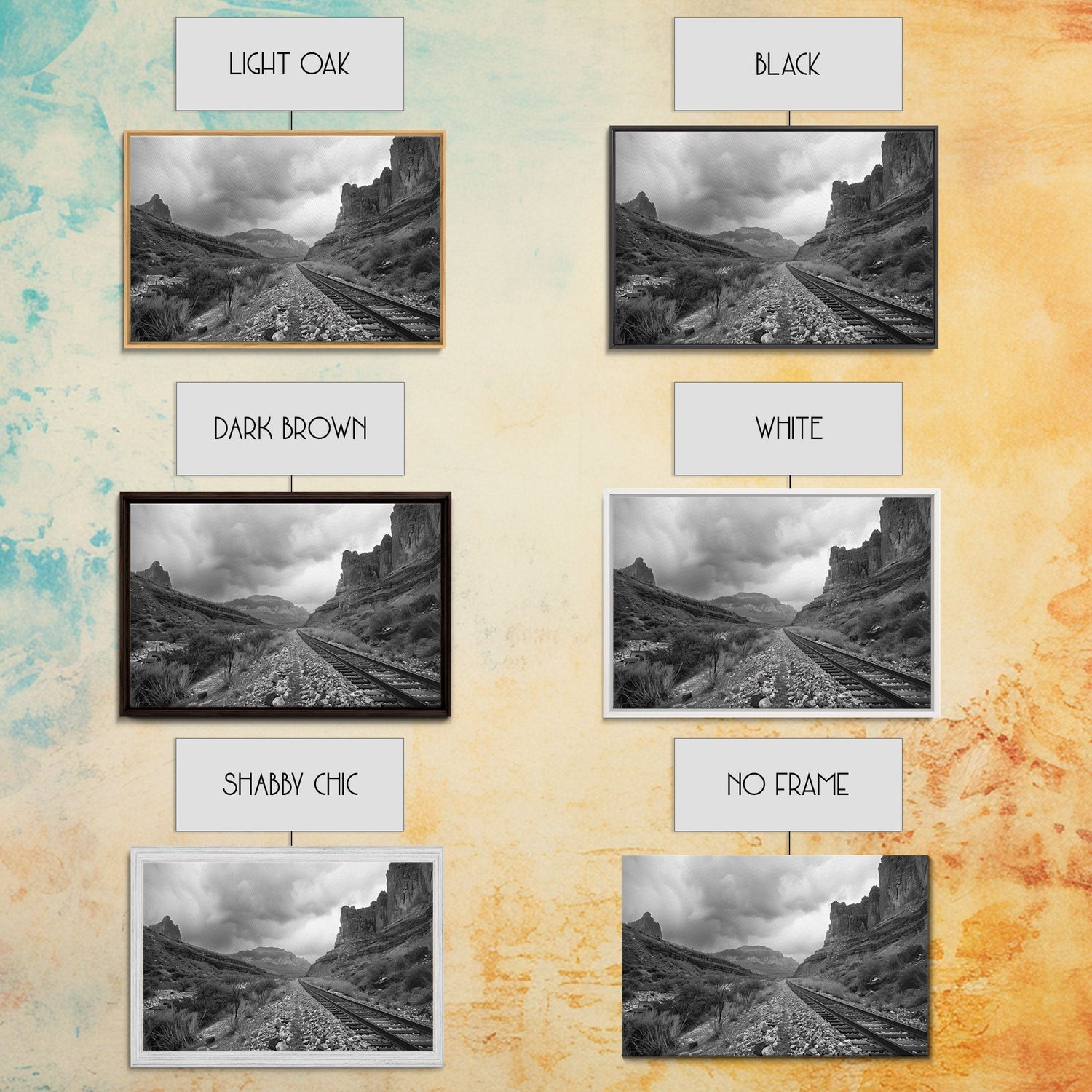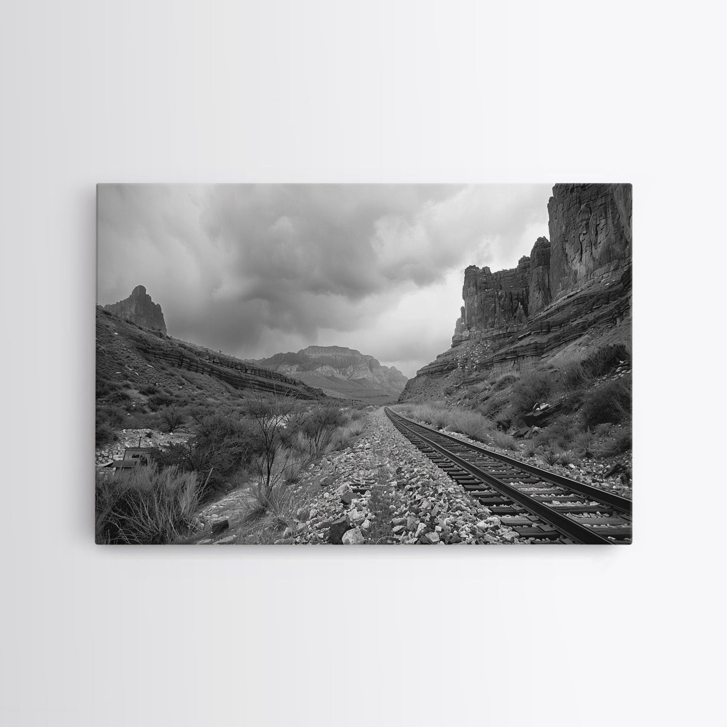 The Train Tracks, Framed Canvas Print, Black and White Western Photography, Wild West Art, Metal Art, Metal Print, Rustic Country Wall Art - 8x12 Inches / No Frame - Stretched Canvas Only is backordered and will ship as soon as it is back in stock.