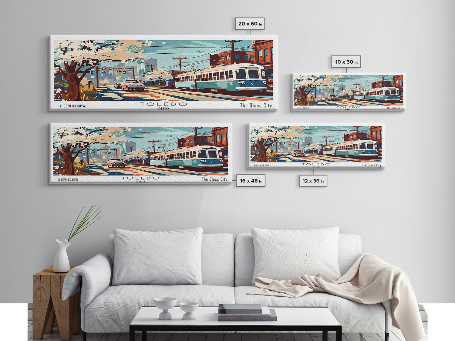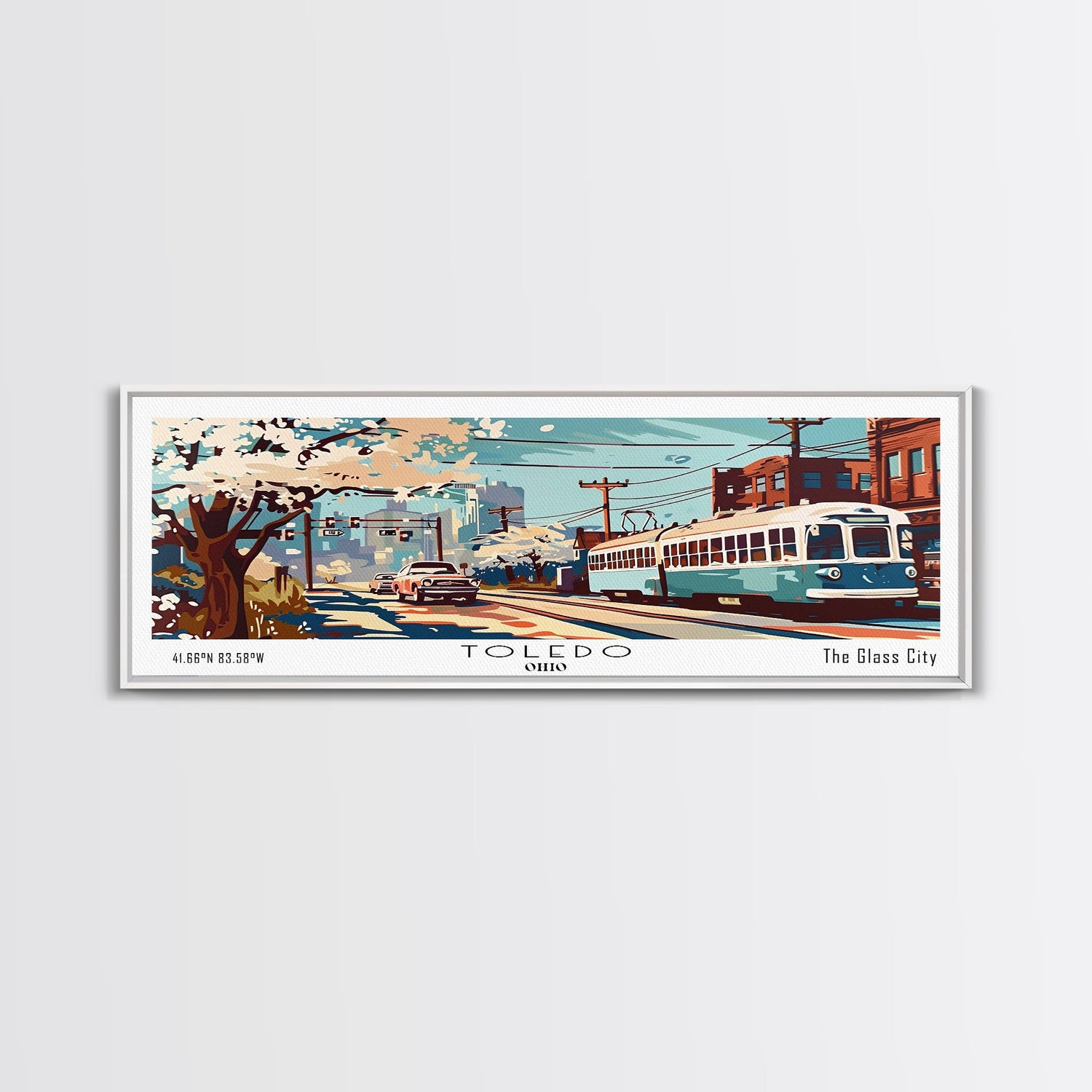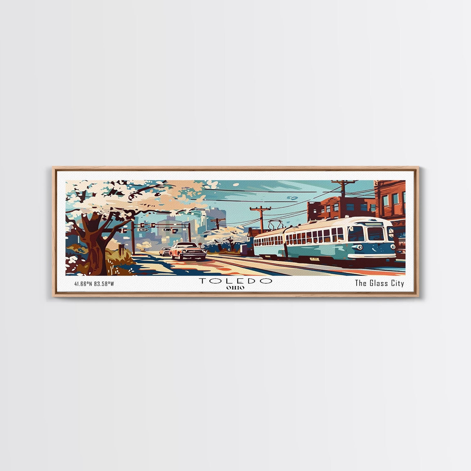 Toledo Ohio Panoramic Wall Art, Mid Century Modern Framed Canvas Print, Retro Pop Art Travel Poster, Living Room and Office Wall Art Decor