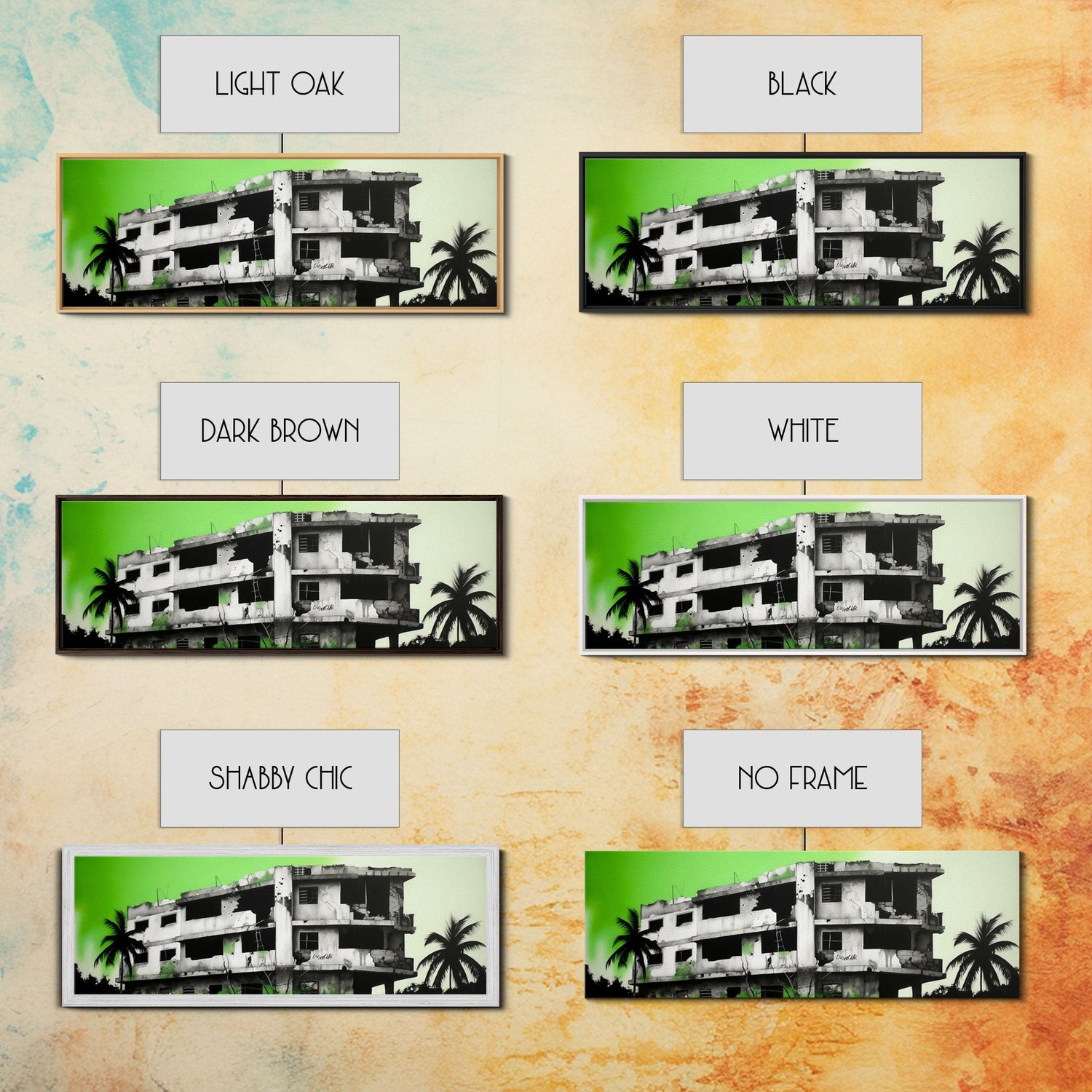 Torn Down Building Art Print, Ruins, Abandoned Structure, Green Background, Large Framed Canvas Print, Panoramic, Wall Art, Canvas Print