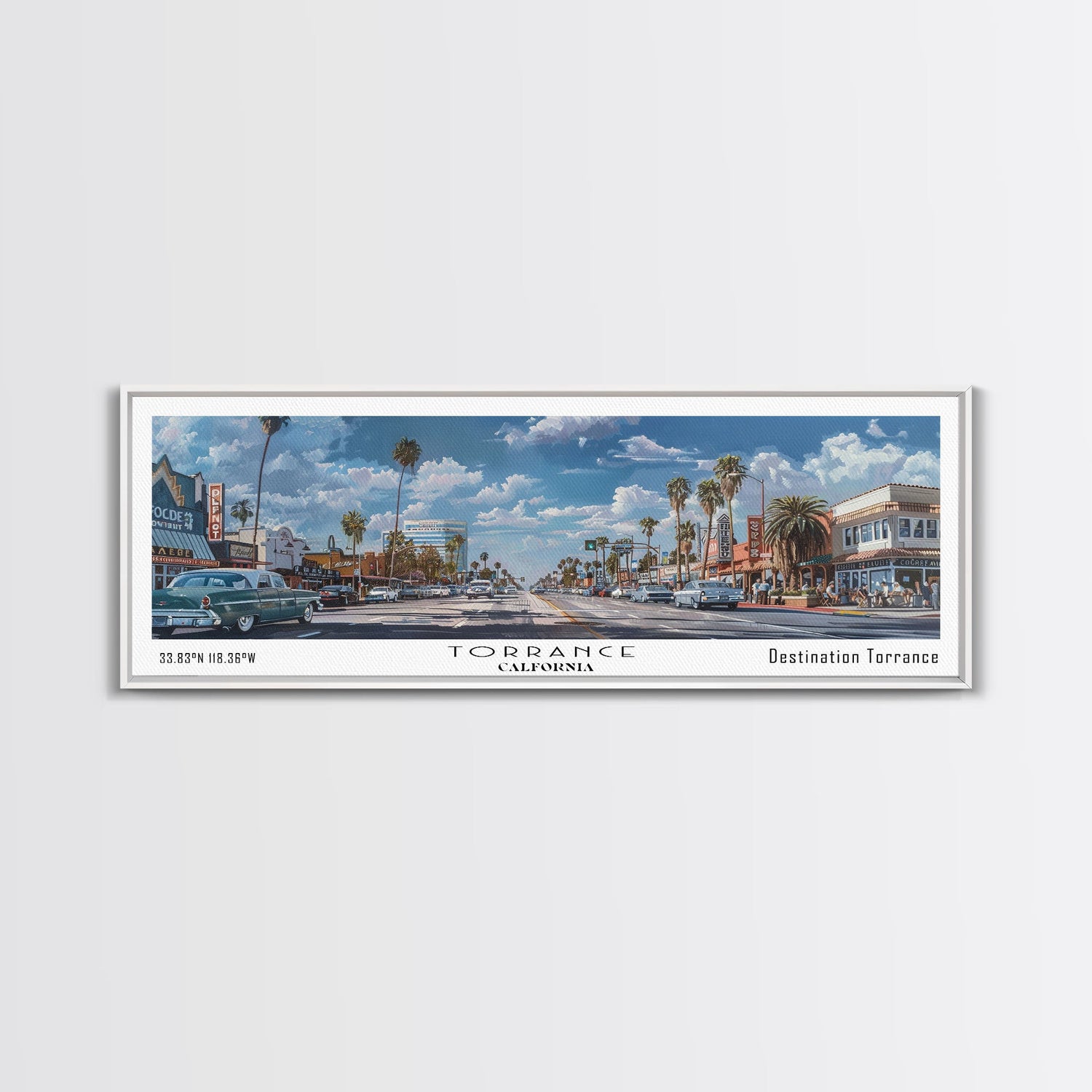 Torrance California Panoramic Framed Canvas Print, Artistic Travel Poster, Retro Wall Art, Unique Living Room Decor, Office Gift, Original Artwork