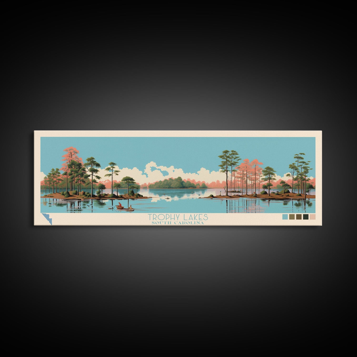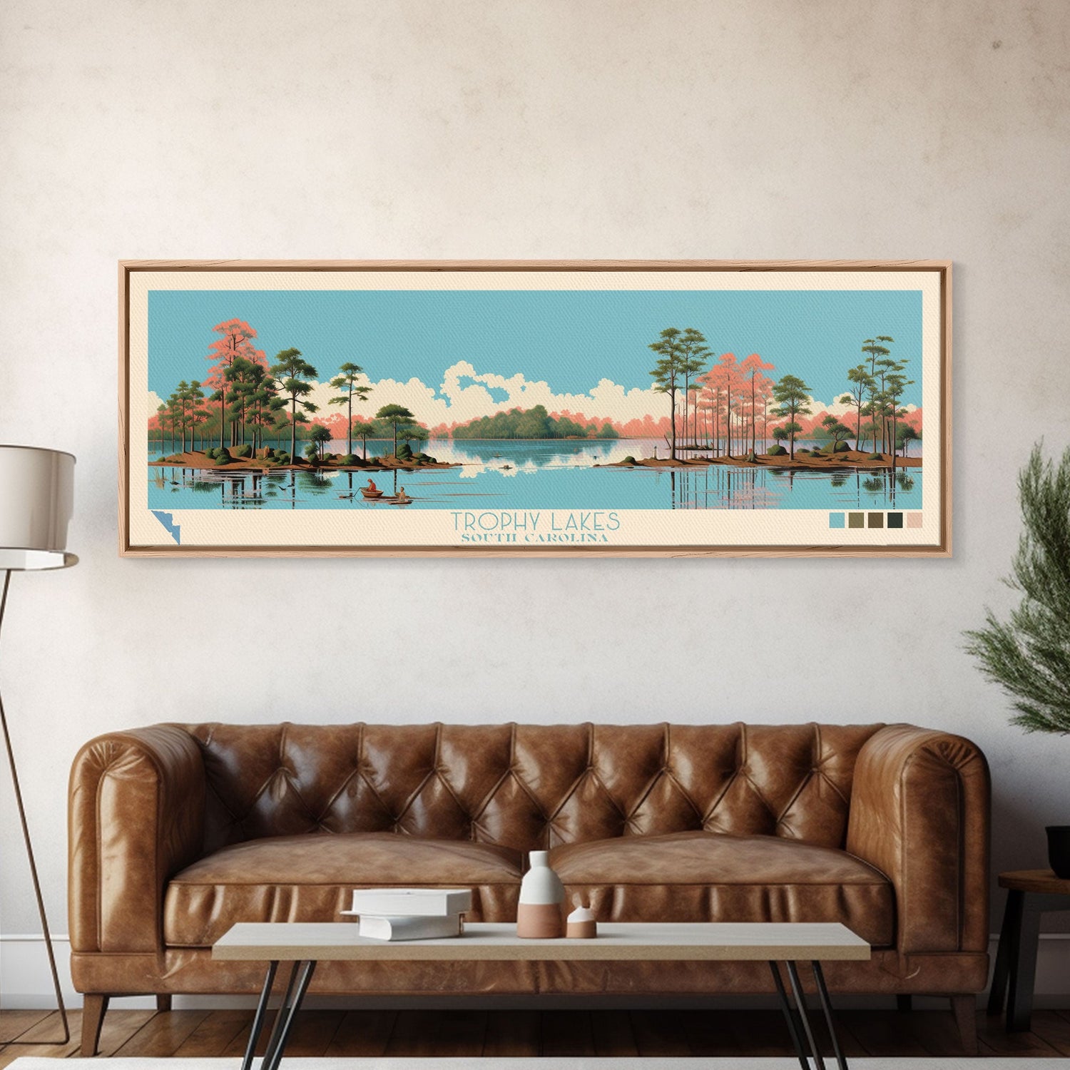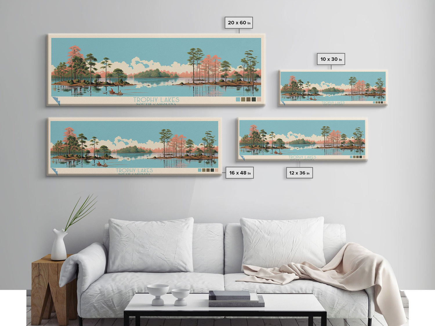 Trophy Lakes, South Carolina Framed Canvas Print, Lake House Decor, Midcentury Modern Art, Pop Art, Travel Poster, Living Room Wall Art - 10x30 Inches / No Frame - Stretched Canvas Only is backordered and will ship as soon as it is back in stock.