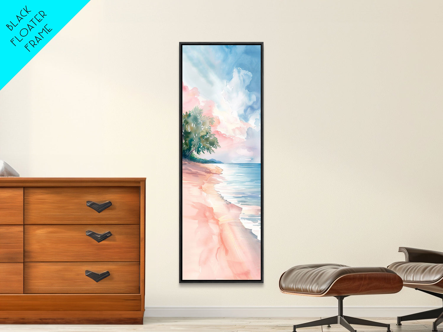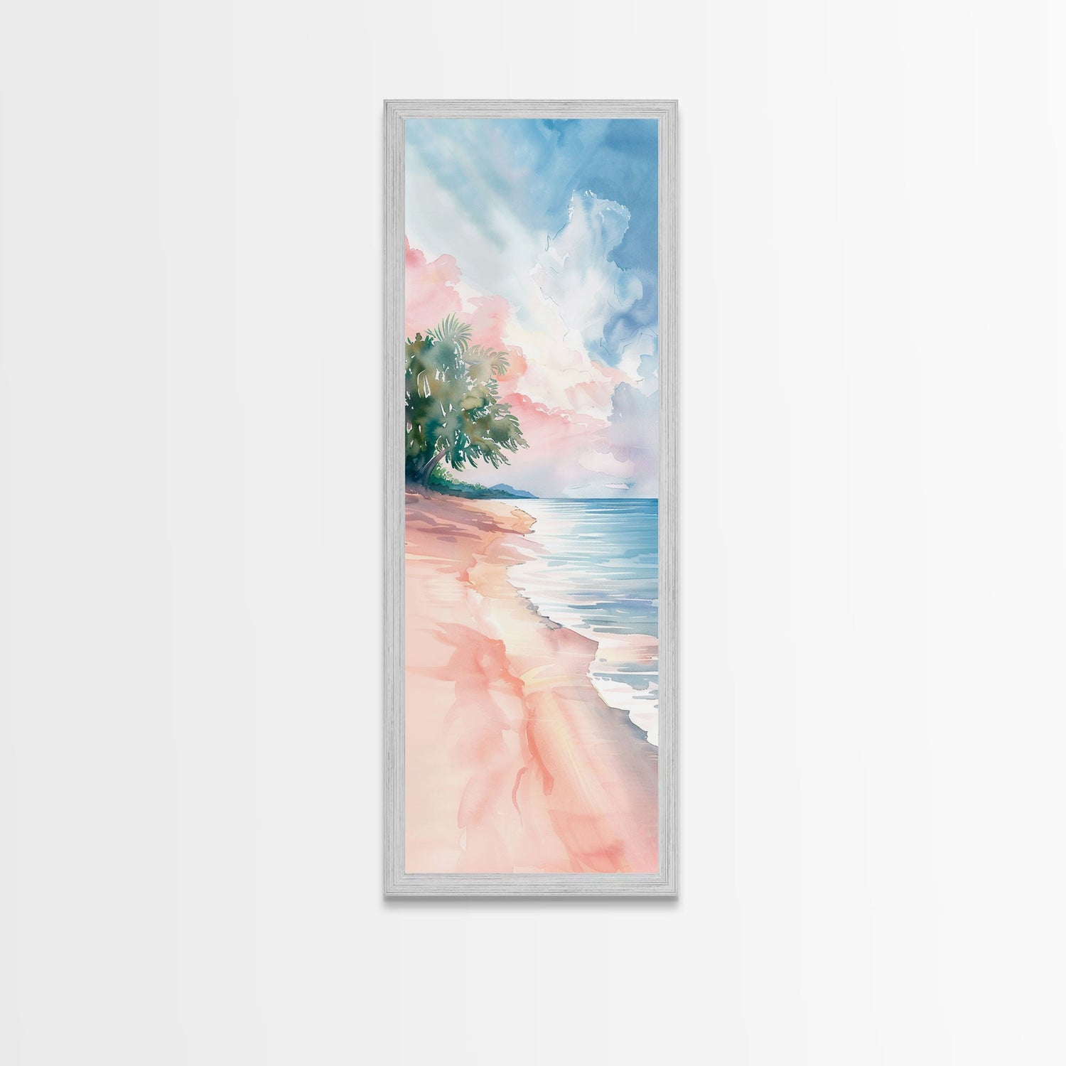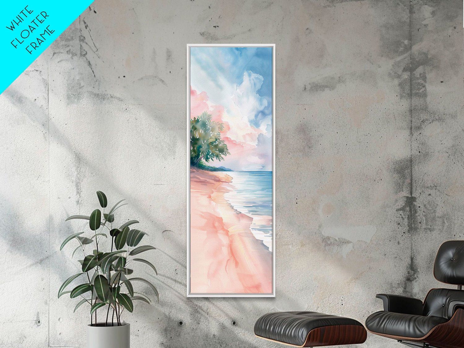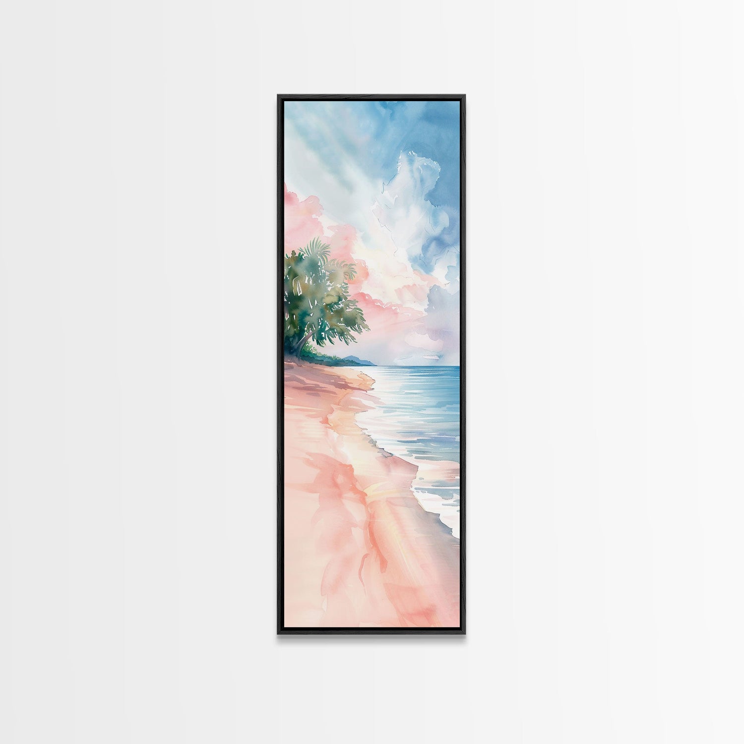 Tropical Beach Watercolor Art - Framed Canvas Print, Skinny Tall Art, Coastal Landscape Wall Art, Living Room Decor, Bedroom Art, Tropical Print